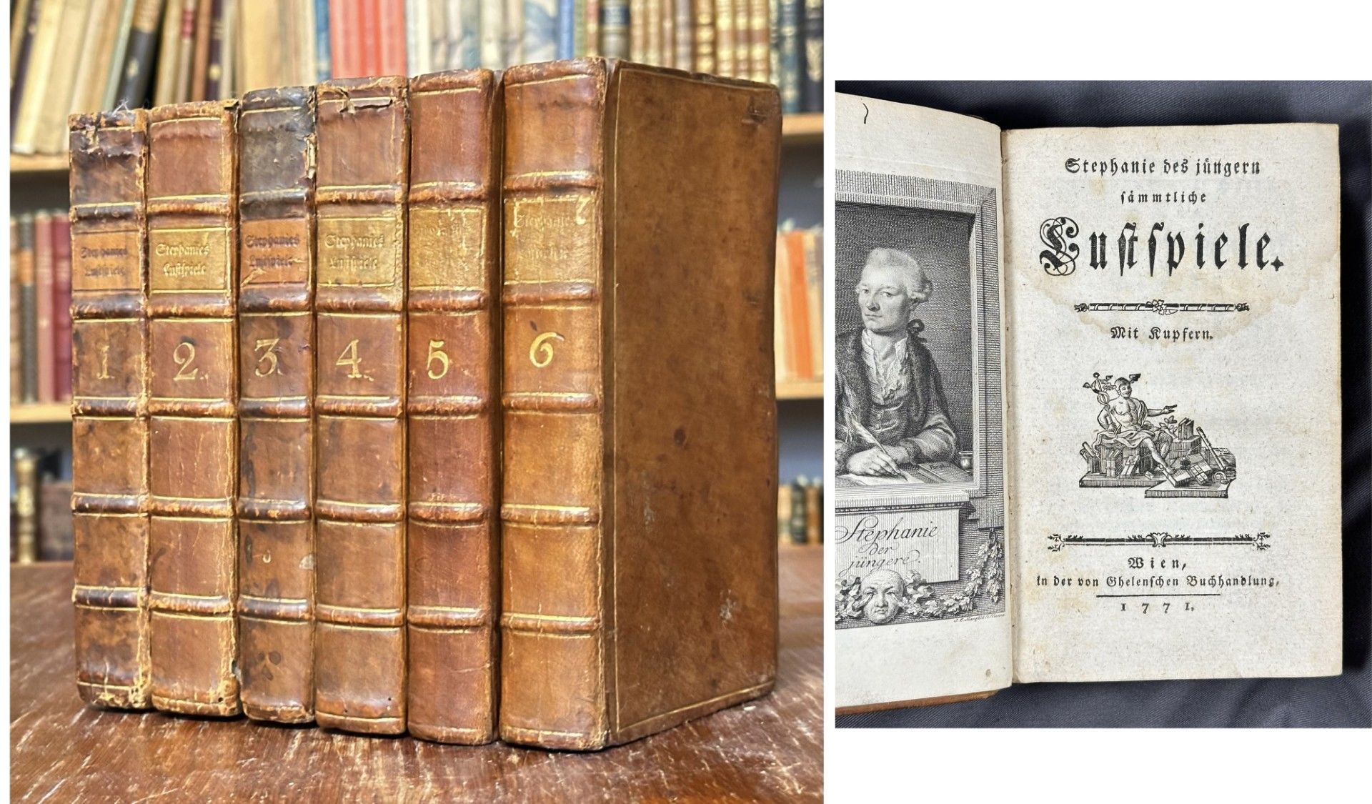 6 volumes. Ghelenschen Buchhandlung, Wien 1771-87. c. 350 pages per volume. Illustrated with copperplate engravings, including the frontespiece portrait of Stephanie. Bound in contemporary full calf bindings. Some leaves with wormholes to the lower margin of volume 1, not affecting text. Slight edgewear. Bookplates. * Scarce. Stephanie [1741-1800] is mainly remembered for writing librettos for Mozart, but was also head of the National Singspiel in Vienna and a central part of the heyday of Vienna and its musical scene.