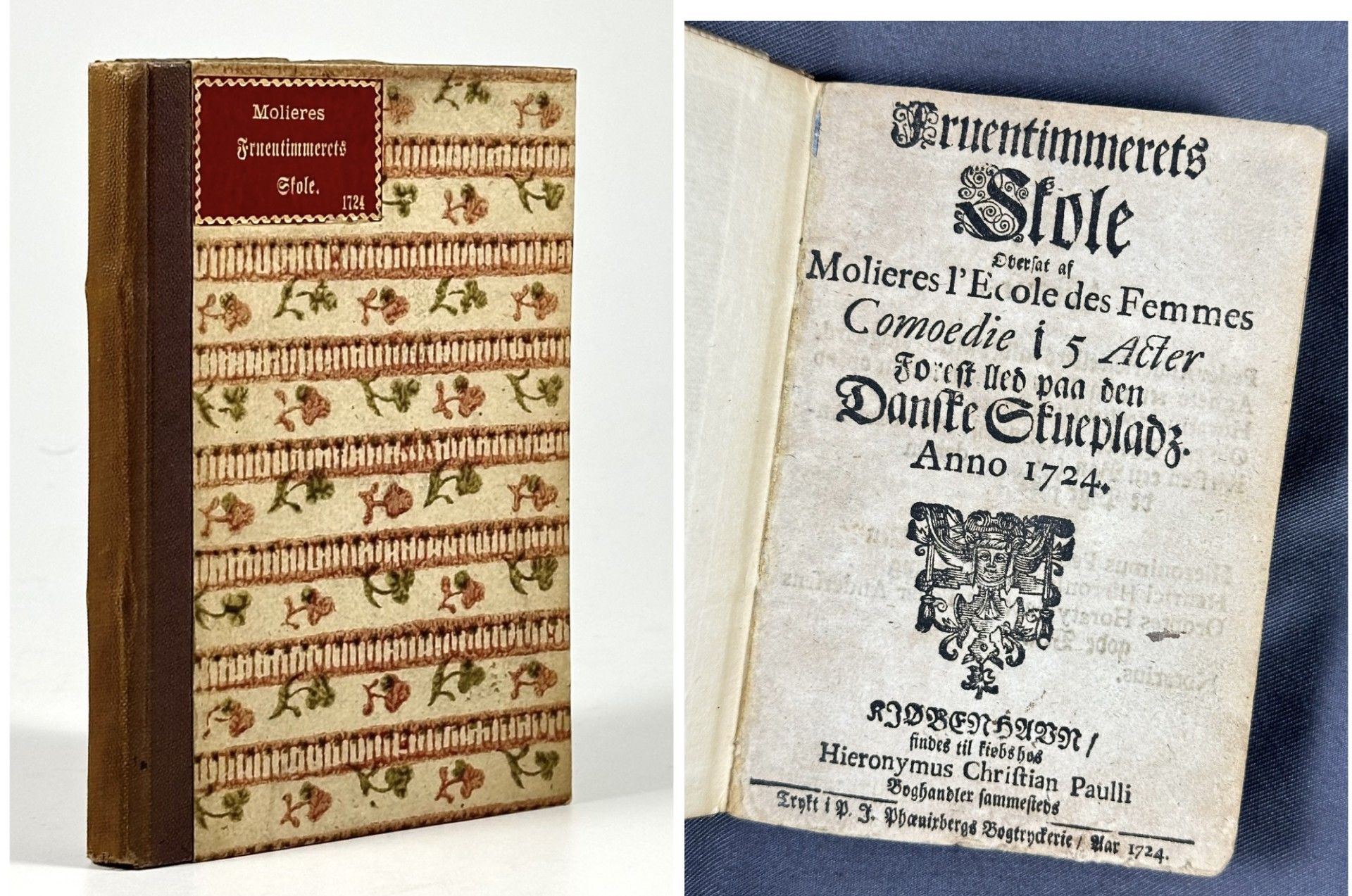 7 bind i 1. Andreas Hartvig Godiche, København 1748-1756. 8vo. Samtidigt helbind af brunmarmoreret kalveskind med rig rygforgyldning. Forreste fals med revner. Øverste kapitæl stødt. * Interessant udvalg af den dramatik, der gik over scenen på det nyåbnede Kongelige Teater, Den Danske Skue-Plads, på Kongens Nytorv i København fra åbningsåret 1748 og frem. 1. Tvistigheden. Comoedie i en Act efter Msr. Marivaux La Dispute (1748). 64 sider. Navnetræk på titelbladet. 2. Den Giftesyge. Comoedie i en Act. (1748). 40 sider. 3. Den uformodentlige Hiemkomst. Comoedie i en Act efter Msr. Regnards L Retour Imprevu (1748). 48 sider. 4. Serenaden Comoedie i en Act (1749). Upagineret (40 sider). 5. Sicilianeren eller Kierlighed Skildrer Comoedie i en Act. Oversat af Molieres Comoedie: Le Sicilien, ou L'Amour Peintre (1749). Upagineret (40 sider). 6. Zeloide. Tragoedie i en Act Af Mr. de St. Foix (1754). 30 sider. 7.Den Gierrige eller Gnieren, Comoedie i 5 Acter paa nye overs. efter det Franske L'avare af Mr. Moliere (1756). 128 sider.
