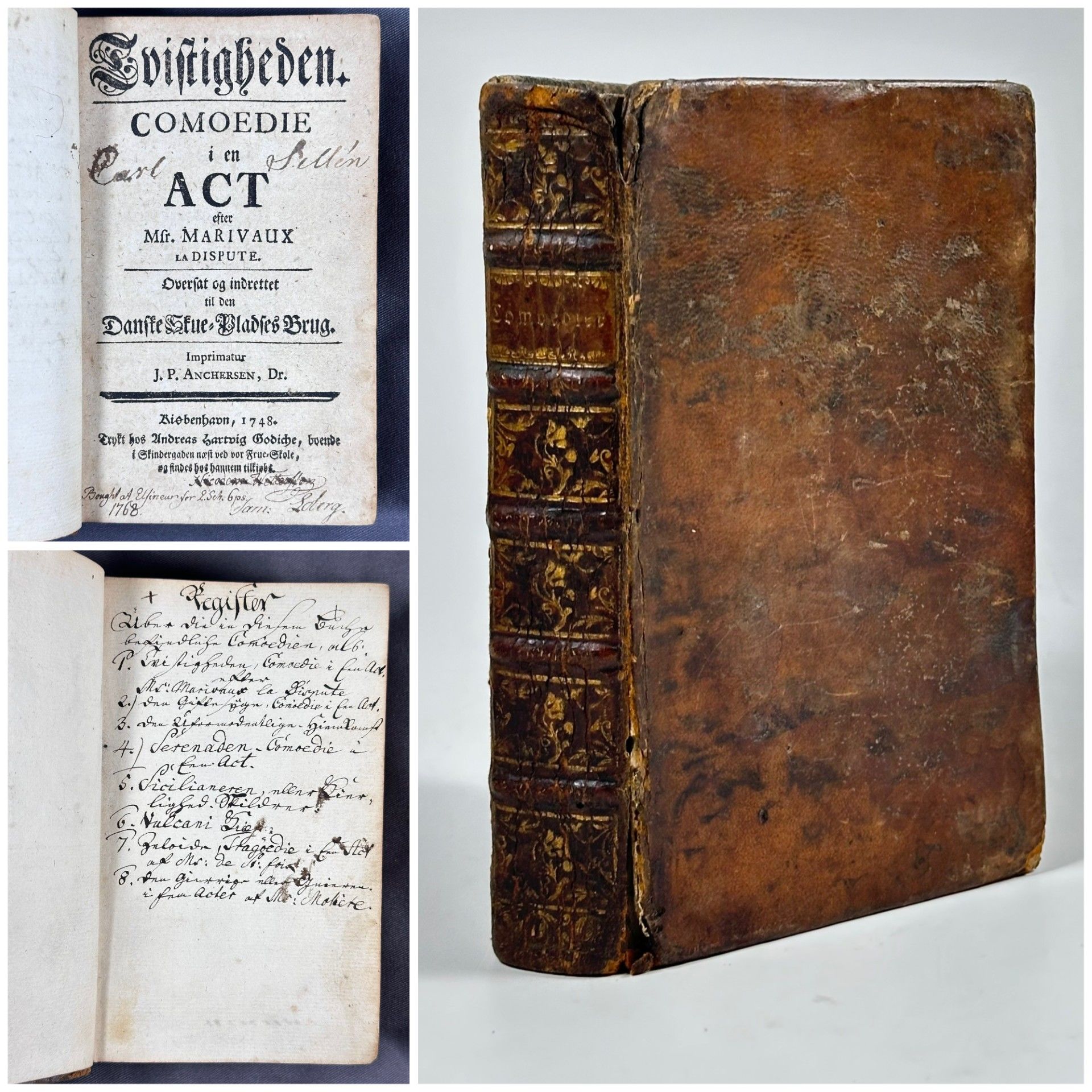 7 bind i 1. Andreas Hartvig Godiche, København 1748-1756. 8vo. Samtidigt helbind af brunmarmoreret kalveskind med rig rygforgyldning. Forreste fals med revner. Øverste kapitæl stødt. * Interessant udvalg af den dramatik, der gik over scenen på det nyåbnede Kongelige Teater, Den Danske Skue-Plads, på Kongens Nytorv i København fra åbningsåret 1748 og frem. 1. Tvistigheden. Comoedie i en Act efter Msr. Marivaux La Dispute (1748). 64 sider. Navnetræk på titelbladet. 2. Den Giftesyge. Comoedie i en Act. (1748). 40 sider. 3. Den uformodentlige Hiemkomst. Comoedie i en Act efter Msr. Regnards L Retour Imprevu (1748). 48 sider. 4. Serenaden Comoedie i en Act (1749). Upagineret (40 sider). 5. Sicilianeren eller Kierlighed Skildrer Comoedie i en Act. Oversat af Molieres Comoedie: Le Sicilien, ou L'Amour Peintre (1749). Upagineret (40 sider). 6. Zeloide. Tragoedie i en Act Af Mr. de St. Foix (1754). 30 sider. 7.Den Gierrige eller Gnieren, Comoedie i 5 Acter paa nye overs. efter det Franske L'avare af Mr. Moliere (1756). 128 sider.