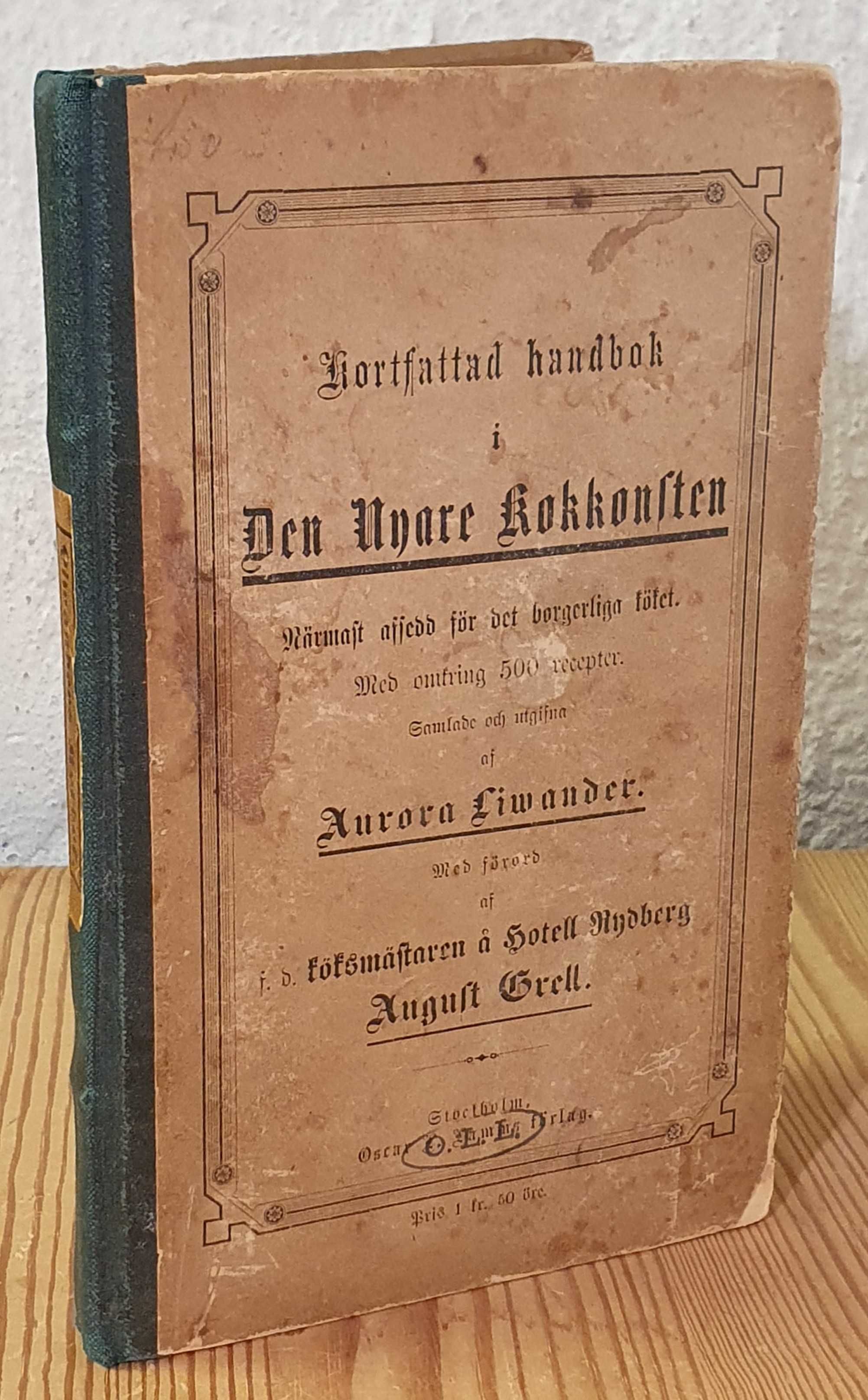 Med omkring 500 recepter samlade och utgifna af Aurora Liwander. Med förord af förre köksmästaren å hotell Rydberg August Grell. Stockholm: Oscar L. Lamm, 1884. xxiii,167 s. Originalklotryggband med tryckta pappärmar. Bandet solkigt och nött. Lös i bindningen. Inlagan med lagerfläckar och en del solkfläckar. 18,5 x 12 cm.