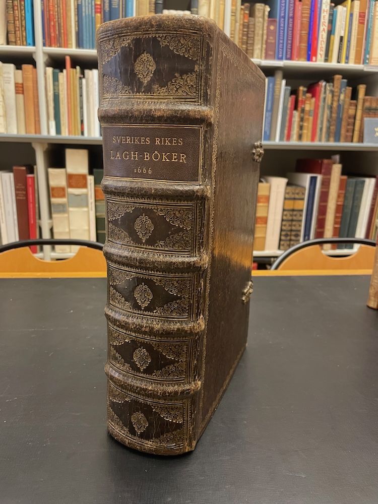Stockholm, Ignatio Meurer, (1665)-66. Folio. Grav. utvikbart titelblad; (7),+ 96 blad,+ (74) s.; (6),+ 47, 49-74 blad; (1),+ 53, 53-54 blad; (4),+ 112 s.; (1),+ 61 blad; (2),+ 44 blad; (2),+ 52 blad; (1),+ 10, 10-24,+ (2),+ 16 blad. Genomgående med lätta småfläckar. Sammanbunden med: Dahle laghen, then i forna tijder hafwer brukat warit öfwer alla Dalarna och them som in om Dala råmärken bodde. Nylig igenfunnin uthi ett gammalt MS.to sampt nu medh summarier och concordantier uplagd med hans kongl. May:ts egen bekostnat. Stockholm, Johan Georg Eberdt, 1676. Folio. (12),+ 36,+ (4) s. Dedikation på titelbladet ”Hr. Secret. O. Austrell”, eventuellt av Johan Hadorph. Sammanbunden med: Then gambla Skåne lagh, som i forna tijder hafwer brukat warit, och nu aff ett gammalt pergamentz MS:to med flijt uthskrifwin, medh nyare codicibus jempnförd och förbättrat, som på nästfölliande blad finnes antecknat, Sampt medh hans Kongl. May:ts bekostnat uplagd. Stockholm, Johann Georg Eberdt, 1676. Folio. (8),+ 72,+ (14) s. Mycket fint samtida skinnband över träpärmar, rikt guldornerad rygg med upphöjda bind men med senare titeletikett, pärmarna med förgyllda ramlinjer, helt och mycket fint ciselerat guldsnitt med blomsterdekor, fina bevarade metallbeslag med bevarade guldornerade läderband. Enligt anteckning av Arvid Hedberg 1941 är bandet av Diedrich Volcker. Collijn sp. 481, 487 resp. 488. Rudbeck 25 (det graverade titelbladet i variant A), 29 resp. 30. Mycket fint exemplar av Meurers stora lagutgåva, som redigerades och utgavs av Claudius Åkerman. Det är en sammanställning av stads- och landslagen med ett gemensamt register, sex av landskapslagarna, ett bihang med domarereglerna, rättegångsordinantie etc. och ett utökat gemensamt sakregister till stads- och landslagen. Innehåller flera av Johann Hadorphs tidigare textutgåvor samt ett nytryck av Georg Stiernhielms utgåva av västgötalagen, sannolikt tryckt 1666 för denna utgåva. Det graverade titelbladet i denna variant består av en portik med kolonner och pilastrar, med titel och årtal i mitten tillsammans med det svenska riksvapnet. Nederst är en graverad vy av Stockholm med stadens tre sigill. Denna titelgravyr har tidigare använts till foliobibeln. Här finns även de två dedikationsbladen till Karl XI och Hedvig Eleonora samt till riksråden, vilka ibland saknas. Samlingen är här sammanbunden med Johan Hadorphs utgåvor av Dala- och Skånelagen, båda från 1676. Dalalagen med anteckningen”Hr. Secret. O. Austrell”. I Dalalagen saknas den latinska varianten av Johan Stiernhööks företal, ”Praefatio” (4 s.). Bandet har förmodligen fått sin titeletikett renoverad av Arvid Hedberg då det på frampärmens insida har dennes anteckning: ”Denna bok är bunden af Didrich Volcker i Stockholm 1671-1706 intygar Arvid Hedberg Hofbokbindare Stockholm 22 juli 1941”. Diedrich Volcker, som kom från Tyskland, gifte sig 1681 med bokbindaränkan Agneta Siwert och kom därigenom att bli Antikvitetskollegiets bokbindare och han blev från 1687 även Kanslikollegiets bokbindare. Ägaren av Dalalagen Olaus Austrel (1640-99) var borgmästare i Stockholm, en tid kanslisekreterare och ledamot av Kommissorialrätten angående trolldomsväsendet. Han var även Magnus Gabriel De la Gardies sekreterare. (Carlander, Svenska bibliotek och exlibris” II, s. 207.) Som stående nära Magnus Gabriel De la Gardie och därigenom sannolikt Hadorph var Austrel förstås även nära Antikvitetskollegiet och kan ha haft tillgång till dess bokbindare Diedrich Volcker.