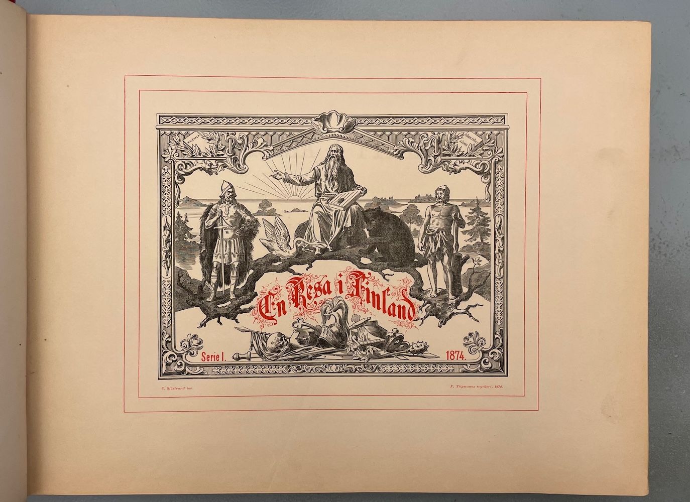 Helsingfors, F. Tilgmanns förlag, 1873-74. Tvär 4:o. Litog. extra titelblad,+ (4),+ 100,+ VIII s.+ 36 stålgravyrplanscher. En plansch (nr 16) med lagerfläckar övriga rena, texten med enstaka småfläckar. Renoverat rött klotband, frampärmen samtida och blindpräglad, ryggen och bakpärmen nya i snarlik stil, helt guldsnitt. Första serien var allt som utkom av denna klassiska skildring av Finland. Planscherna är graverade av A. Weger. Utkom även i en finsk, tysk och en rysk utgåva.