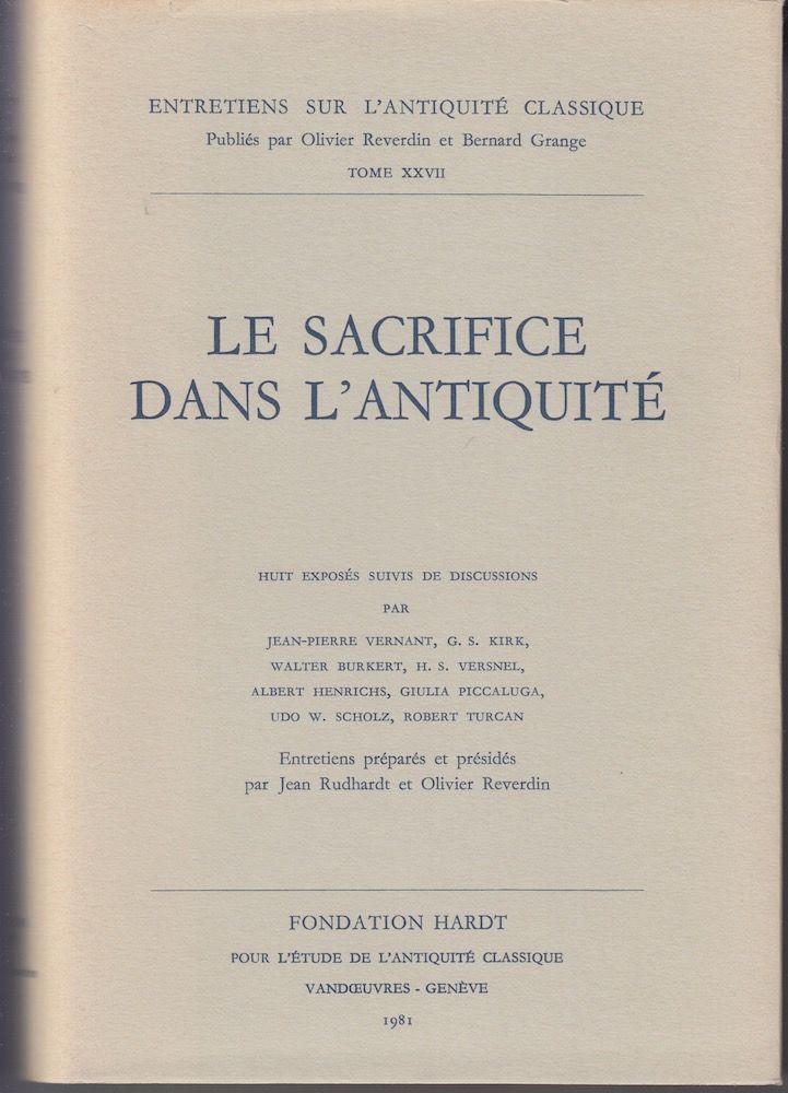 Le sacrifice dans l’antiquité. Huit exposés suivis de discussions par Jean-Pierre Vernant, G. S. Kirk, Walter Burkert, H. S. Versnel, Albert Henrichs, Giulia Piccaluga, Udo W. Scholz, Robert Turcan. Entretiens préparés et présidés par Jean Rudhardt et Olivier Reverdin.
