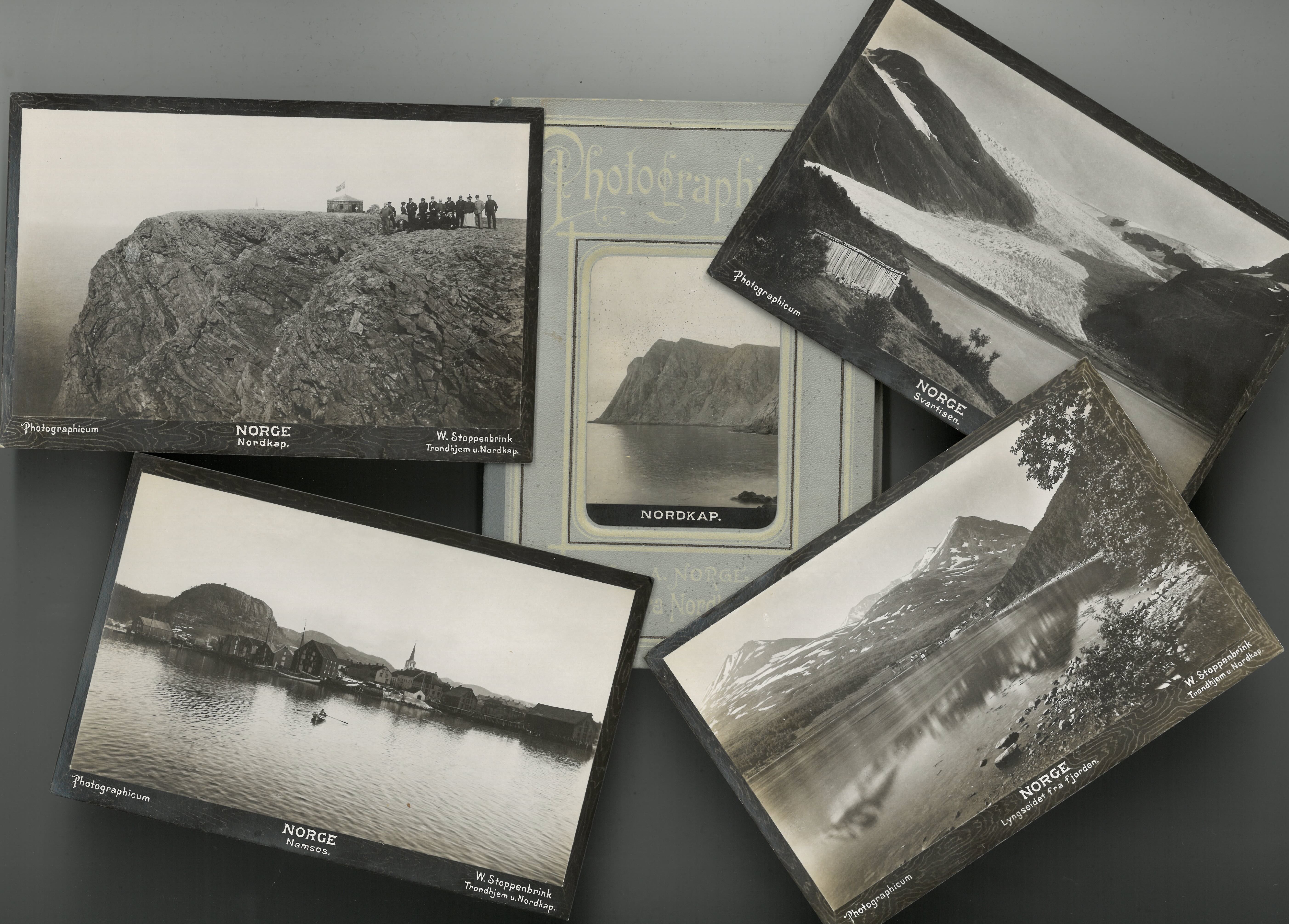 Fotografiene signert trykt W. Stoppenbrink, Trondhjem u.Nordkap. Følgende motiver : “Renhjord”, “Nordkap, Udsigt mod Nord”, “Nordkap”, “Namsos”, “Nordkap”, “Øvre-Leerfos”, “Lyngseidet fra fjorden”, “Svartisen”, “Hornviken, opstigningen til Nordkap”, “Svartisen”.