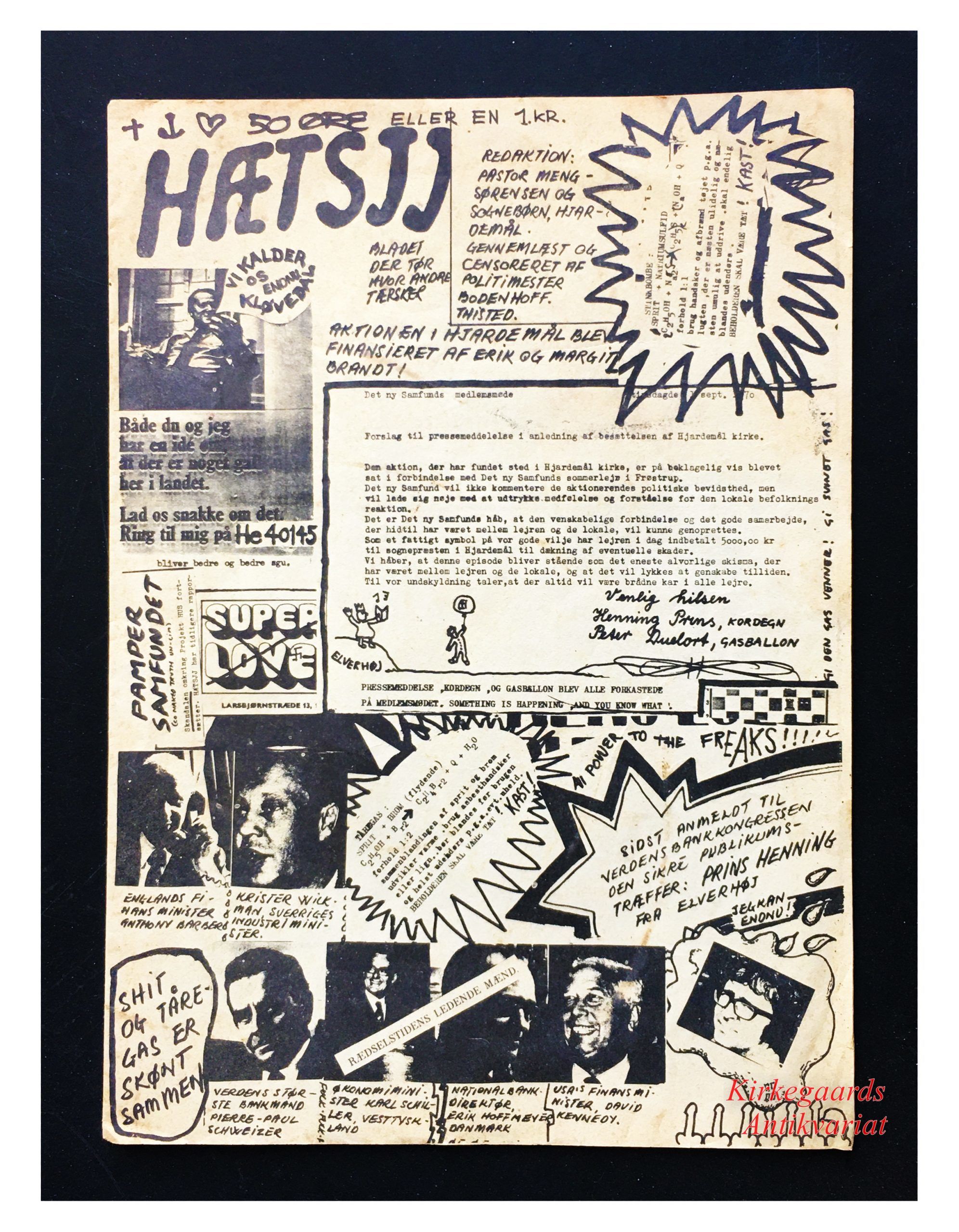 Eks-skolens trykkeri, København September 1970. 4 sider. Velbevaret. Extremely rare! One of the 48 original issues of the Danish avantgarde artist magazine, the "newspaper" HÆTSJJ (Haetsjj = "Kerchoo") published between 1968 and 1970, this copy from September 1970. This issue deals with the "happening" at Hjardemål 31st August 1970 - the occupation or liberation of Hjardemål Church, which is close to the Thy camp - by Bodil Marie Nielsen, Peter Louis Jensen, Lene Adler Petersen, Bjørn Nørgaard among others. - The magazine is an example of what Nylen describes, and with most of the mentioned elements featured in it - "From the start of the Campaign for Nuclear Disarmament and the public events staged by the situationists and Fluxus in the early 1960s, symbolic actions in public spaces became the focus of political movements, youth culture and the arts. Collective action became the favoured mode of the 1960s, not only in political movements but also in the communes formed by young people who wanted alternative lifestyles, or just an affordable place to live, and in, for instance, popular music, where the rock group took the place of the individual pop star, as well as in art collectives, which organised their own schools (such as the Ex-School in Copenhagen) or assembled to produce little magazines, experimental films or utopian societies, animated by the do-it-yourself style of the new youth culture. For a moment in the second half of the ’60s it seemed possible for the politi-cal movements, the youth culture and the avant-garde to merge and create a huge wave of change that would permanently transform society. The Swedish writer Leif Nylén has described how these three movements overlapped in Sweden: The political students’ movement had its emotional background in the youth revolt, and any political demonstration would be full of Dylan lovers and Beatles fans. Young avant-garde artists were attracted to the concerts and dance halls of the youth culture, where the distinction between high and low culture would dissolve in a way that had been the aim of the avant-garde movements ever since the discussions of cultural democracy and the culture wars of the early 1960s. And the simple pop and rock music of the early 1960s developed into more sophisticated and experimental music which fused with the avant-garde scene".