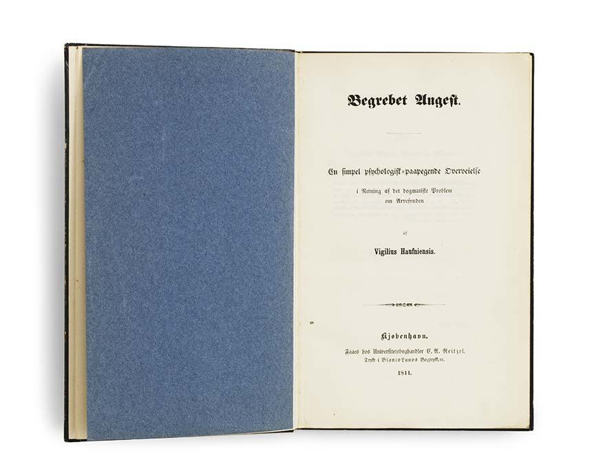 Kjøbenhavn, Reitzel, 1844. 8vo. (8), 184 pp. Bound in a black glitted full paper binding mimicking Kierkegaard’s gift-bindings. With Gothic gilt lettering and printing year to spine. Top edge gilt, otherwise uncut. Bound by Anker Kyster’s Eftf. 1958, more specifically Bent Andree, with his name in pencil under the book-binder stamp on front free end-paper. A bit of wear to extremities. One leaf loose. The copy is a most curious one. It was been washed and restored and then bound by one of Denmarks’ best bookbinders of all time, clearly under specific instructions to both keep it original, but to also reflect the typical bindings Kierkegaard had made. The copy is on fine, bright white vellum-paper (!), uncut, and bound with the original back-strip with the original printed title-label, preserving all of the printed text and with blank blue wrappers of the exact same paper as the back-strip. To our knowledge, The Concept of Anxiety did not appear in blue blank wrappers. It did, however, appear in the characteristic blue paper binding. The wrappers here bound in, however, do not match this paper exactly.