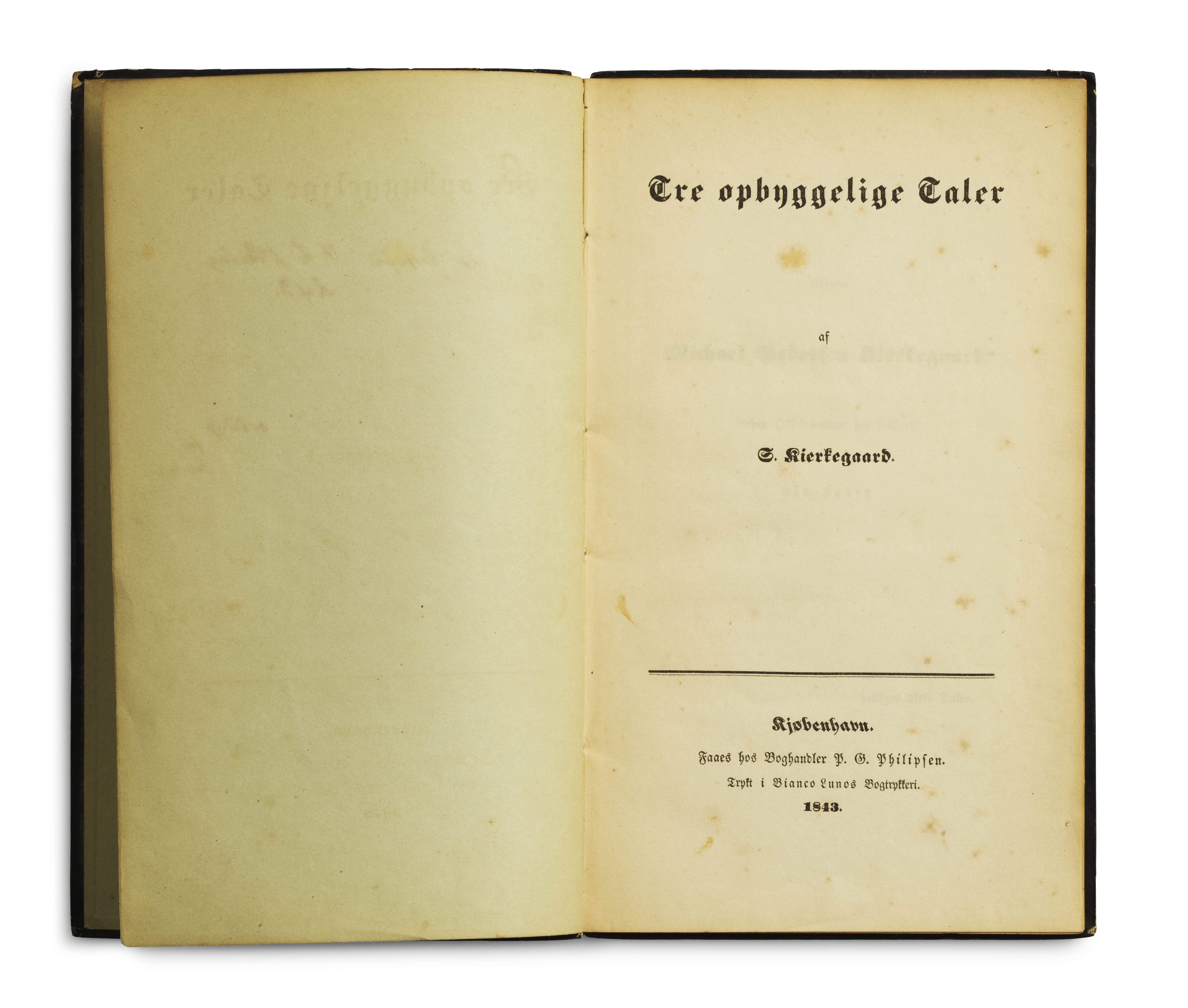 One of two known presentation-copies of the important Three Upbuilding Discourses from 1843, the religious companien to Fear and Trembling from the same year, inscribed by Kierkegaard to Heiberg, on front free end-paper: "Til / Hr. Professor J.L. Heiberg / R af D. / ærbødigst / fra / Forfatteren. (i.e. For / Mr. Professor / J. L. Heiberg / R af D (i.e. Ridder (Knight) of Dannebrog) / most respectfully / from the Author). Kierkagaard's Upbuilding (or Edifying) Discourses were published over the course of two years, in 1843 and 1844. In all, 18 Upbuilding Discourses were published, divided over six publications, namely: Two Upbuilding Discourses from 1843, Three Upbuilding Discourses from 1843, Four Upbuilding Discourses from 1843, Two Upbuilding Discourses from 1844, Three Upbuilding Discourses from 1844, Four Upbuilding Discourses from 1844. Each of these publications accompanied one of the main pseudonymous works, beginning with Either-Or in 1843. As opposed to his major philosophical works, the religious upbuilding discourses actually bear the name of the author on the title-page. Of course, this was by no means incidental. While the pseudonymous works could raise the question of the religiousness of the author, the parallelly written religious discourses stress the fact that we are dealing with an author, who was religious from the very beginning – an essential fact that Kierkegaard wished to stress for those interested in his authorship. In his journals, Kierkegaard clearly states that the religious discourses are as significant in his oeuvre as a whole as are the larger pseudonymous works, "I began with "Either-Or" and two upbuilding discourses..." he says, and explains that he intended the upbuilding, the religious, to advance, and that he wanted to show "that the writer was not an aesthetic author who in the course of time grew older and for that reason became religious". (Journals, IX A 227). He was religious all along, also during all of the major philosophical publications that were not written in his name. The fact that every major pseudonymous work – up until Concluding Unscientific Postscript appeared and revealed the identity of the real author – was accompanied by one of these small Upbuilding Discourses, bears testament to the pivotal role they play in Kierkegaard's philosophical development. Furthermore, while Kierkegaard could not present anyone with copies of his pseudonymous works (as his name did not appear as the author on the title-page), he could indeed give away presentation-copies of his accompanying Upbuilding Discourses, which he then did. Most of these presentation-copies are in the typical black glitted paper bindings with single gilt lines to spines. Some, however, are in the original printed boards. The trade copies appeared in original wrappers, some of them blank, some of them printed, repeating the printing from the title-page within a printed frame. In May 1845, the publisher Philipsen buys the remainder issues of all six Discourse-publications, has a joint title-page printed along with a contents-leaf and now issues all six Discourse-publications together under the title Eighteen Upbuilding Discourses. The idea of the Eighteen Upbuilding Discourses. He had agreed to it, but it was not his intended project with the Upbuilding Discourses. Therefore, he wished for the book not to be reviewed, and he naturally did not give away any copies of the Eighteen Upbuilding Discourses, only the individual publications. In all, seven presentation-copies of the different Upbuilding Discourses are registered, all being for either Heiberg or Nielsen. Johan Ludvig Heiberg (1791-1860) was a Danish poet, playwright, literary critic, literary historian, philosopher, and quite simply the main cultural figure of 19th century Denmark. Heiberg profoundly influenced all of Danish culture within this period and must be considered the patron of Copenhagen's literati. He was very influential as a thinker in general, and he changed Danish philosophy seminally by introducing Hegel to the Northern countries. Needless to say, Heiberg also played a significant role in relation to Kierkegaard, who will comment on and refer to him continually throughout his career. As the unofficial arbiter of taste for the Danish intellectuals, Heiberg was also an inevitable recipient of Kierkegaard's works as they were published. "There can be no doubt that Johan Ludvig Heiberg was a very important figure for the development of Kierkegaard's thought. Heiberg's criticism dominated an entire generation of literary scholarship and was profoundly influential on the young Kierkegaard. His dramatic works and translations are also frequently referred to and quoted by Kierkegaard and his pseudonyms… However, Heiberg was also a philosopher… His philosophical profile is clearly that of a Hegelian, and, not least of all due to Kierkegaard's influence, this has led him to being unfairly dismissed…" (Jon Stewart in: Kierkegaard and his Danish Contemporaries I: p. (35)). Heiberg was there from the very beginning of Kierkegaard's authorship, and although the two had both diverging personalities, diverging opinions, and diverging philosophies, Kierkegaard will have had respect for his place in society. Kierkegaard viewed himself as somewhat of an outsider, and it was of great importance to him to try and enter the famous literary and cultural circle of Heiberg. Heiberg is known for founding his own school of criticism and for his brilliant polemics against literary giants of the period. He was without comparison the most dominant literary critic of the period, and he reformed Danish theatre, introducing eg. French vaudeville to the Danish stage. Although through foreign influence, he ended up creating for the first time an actual national theatre in Denmark. "Heiberg's success in so many different fields during such a rich period is truly remarkable." (Jon Stewart). Furthermore, he profoundly influenced