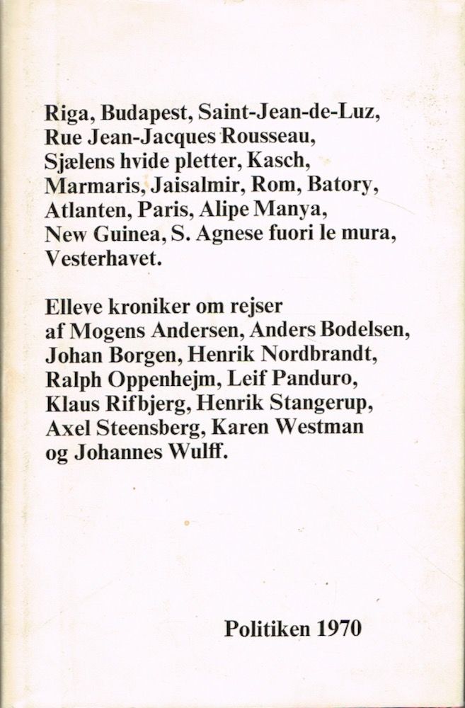 Riga, Budapest, Saint-Jean-de-Luz, Rue Jean-Jacques Rousseau, Sjælens hvide pletter, Kasch, Marmaris, Jaisalmir, Rom, Batory, Atlanten, Paris, Alipe Manya, New Guinea, S. Agnese fuori le mura, Vesterhavet. Elleve kroniker om rejser af Mogens Andersen, Anders Bodelsen, Johan Borgen, Henrik Nordbrandt, Ralph Oppenhejm, Leif Panduro, Klaus Rifbjerg, Henrik Stangerup, Axel Steensberg, Karen Westman og Johannes Wulff.