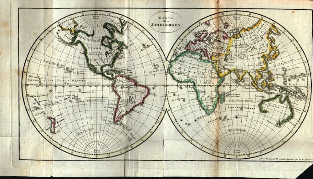 Stockholm, 1804. 12mo. 171, 182 s. Illus. med 2 plansjer av Samojeder. Foldeplansje med verdenskart, kolorert. Samtidig skinnbind. Slitasje på permene. Øvre kapitél mangler. Litt brunplettet helt i øvre kant. Nedre 1/3 av side 21 i del 2 er klippet ut. Noen korte rifter i kartet. Ellers pen. Gamle eierinnskripsjoner og ex libris. . (Eget förlag) Svensk. Heri en Resa till Spetsbergen och Nova Zemla.