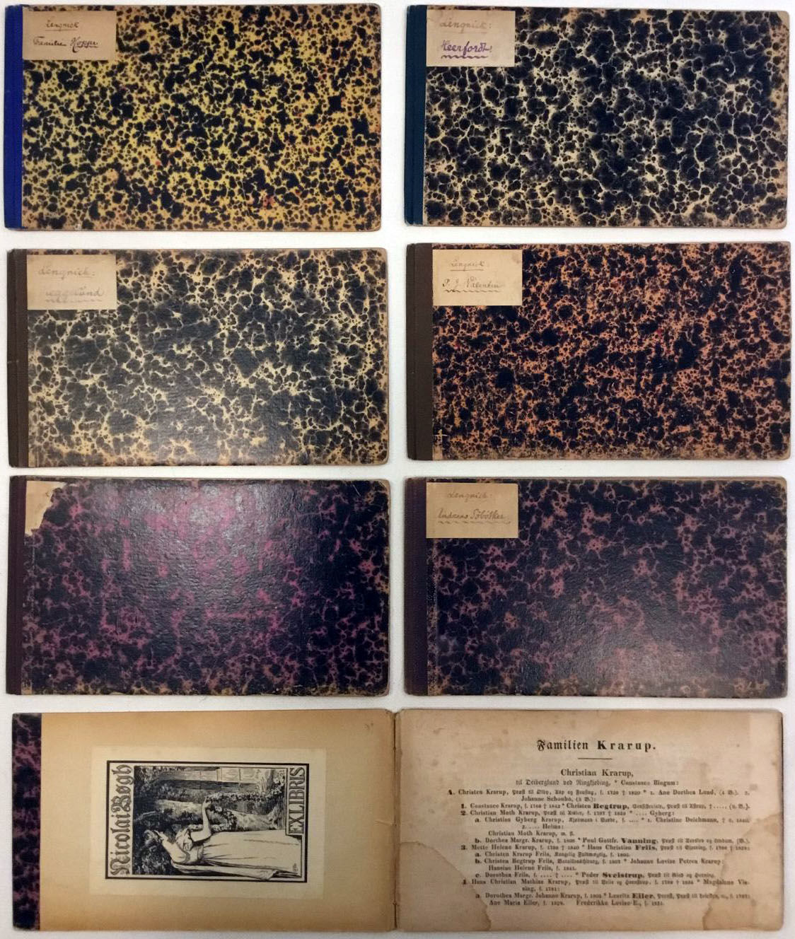Danmark, ca. 1840. 7 hefter i tverrformat med stamtavler. ExLibris. Smuss og slitasje