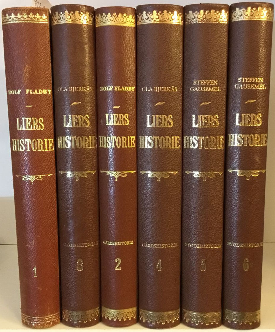 Lier 1953-1969. Lier Bygdeboknemnd. Stor 8vo. Illustrert med for og faksimilar. Originale brune skinnryggbind med gyllen ryggtekst. Stempel på forsatsane. Eit solid og godt sett, lite brukt