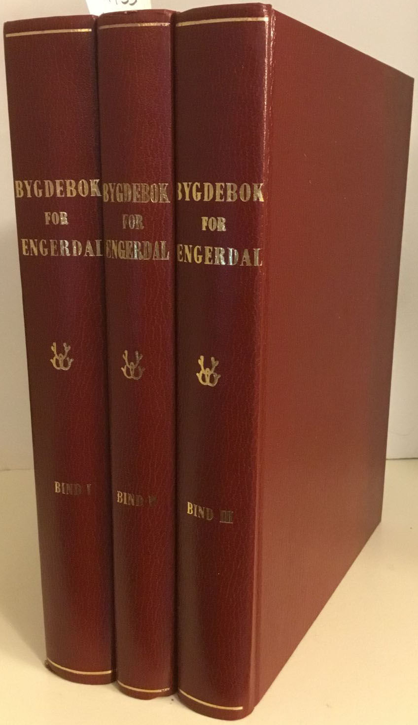 Elverum 1981. Utgitt av Engerdal kommune. Store 8vo. 554 (+1) + 396 (+1) +508 s. illustrert. Utbrettplansje i Bind II. Burgunder kunstskinnbind med gyllen ryggskrift. Svakt bølga papir i nede hjørne i dei siste femti sidene i Bind III, elles eit sett i god stand