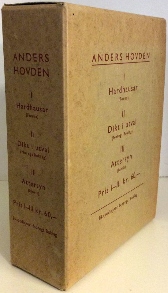 Oslo 1959. Fonna Forlag - Noregs Boklag - Olaf Norlis forlag. 8vo. 188 + 224 + 235 (+3) s. Originalbind. Rosa omslag med svart ryggtekst. I original pappkassett. Eit solid og godt sett