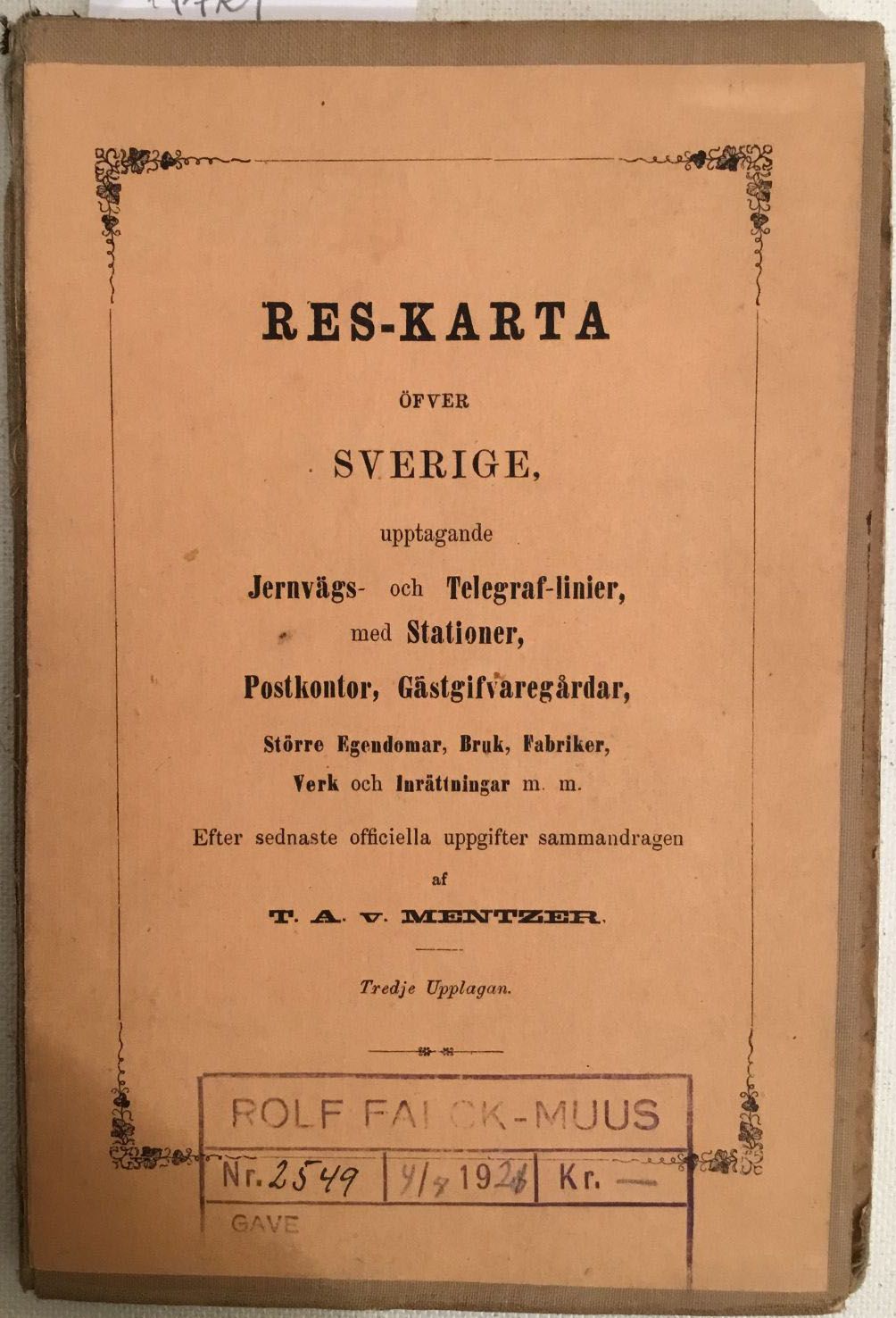 Res-karta öfver Sverige upptagande Jernvägs- och Lelegraf-linier, med Stationer, Postkontor, Gästgifvaregårdar, Større Egendomar, Bruk, Fabriker, Verk och Inrättningar m.m. Efter sednaste officiella uppgifter sammandraen af T. A. Menttzer. Tredje Upplagan