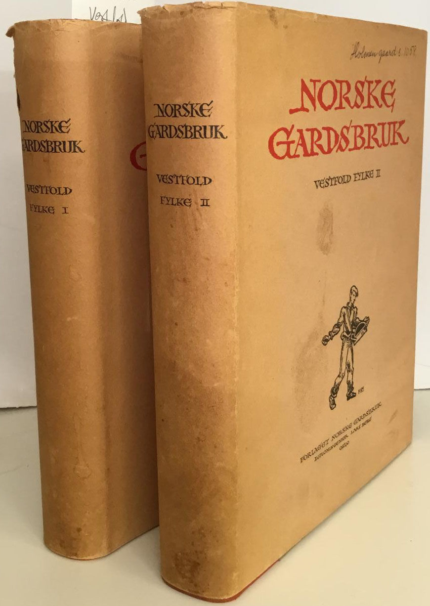 Oslo 1947. Forlaget Norske Gardsbruk. 4to. 1382 + VII s. Illustrertmed bilet av dei einskilde gardane. Kart. Vignettar, friser og bokbind av Frøydis Haavardsholm. Originale skinnryggbind. Brunlege smussomslag med svart ryggtekst. Eit solid og godt sett