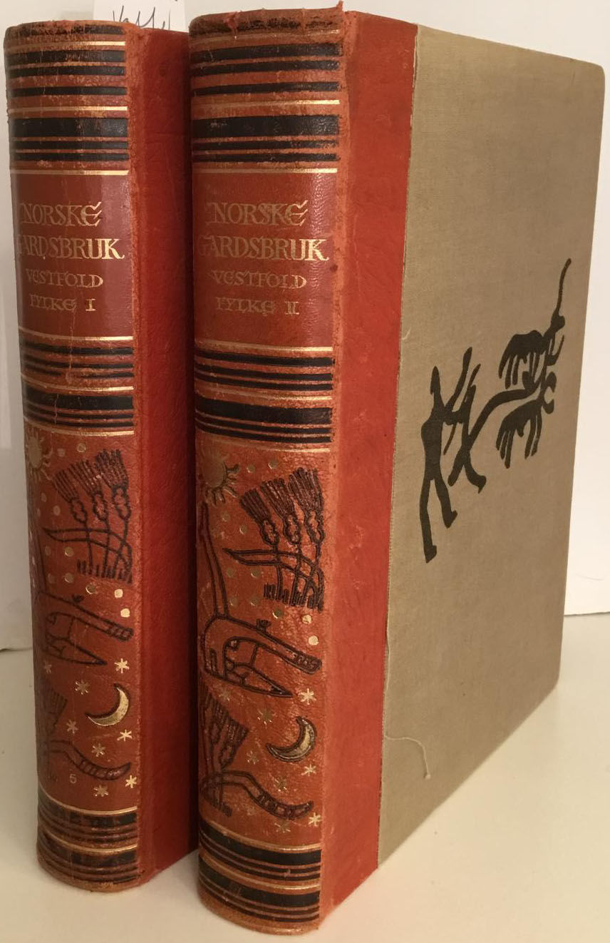 Oslo 1947. Forlaget Norske Gardsbruk. 4to. 1382 + VII s. Illustrertmed bilet av dei einskilde gardane. Kart. Vignettar, friser og bokbind av Frøydis Haavardsholm. Originale skinnryggbind mes gyllen ryggtekst. Noko bruksslitasje, ørlita rift øvst i ryggen på band 2, elles eit sett i generelt god stand