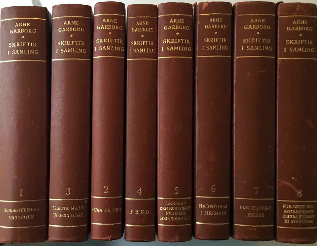 Oslo 1951. 8vo. Ulik pag. Originalbind. Brune skinnryggar m. dekorstriper og gyllen tekst. Pene