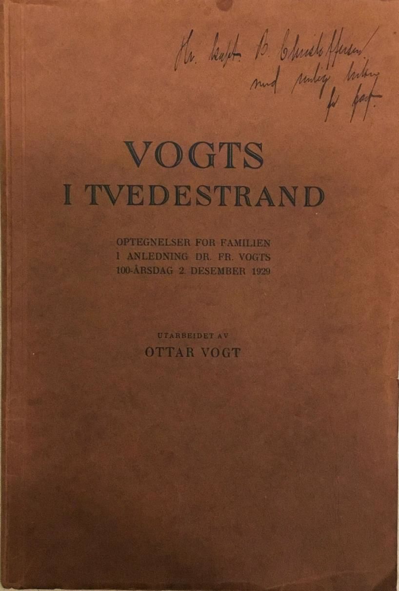 Vogts i Tvedestrand. Optegnelser for familien i anledning Dr. Fr. Vogts 100-årsdag 2. desember 1929