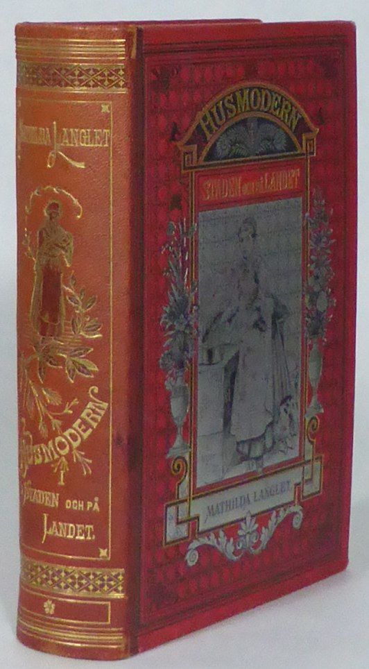 Stockholm; Bonniers, 1892. 21,5x14,5 cm. (2, 2 blanka), xii, 1122 s. + förlagsreklam. Förlagets röda, dekorerade skinnryggband med marmorerade snitt. Ryggen svagt blekt och aningen nött. Pärmhörnen lätt tilltryckta. Svaga skrapmärken på bakre pärm. S. 1095-1098 delvis loss samt med lite skrynklad marginal. Fint ex. Ungefär halva boken ägnas åt matlagning. Med kapitel om trädgårdsskötsel, ladugårdsskötsel, handarbeten och uppfostran. Langlet (1832-1904) verkade främst som författare och översättare av barn- och flickböcker men gav även ut ett antal böcker i hushållnings- och uppfostringsfrågor. Gunnel Furuland skriver i Svenskt kvinnobiografiskt lexikon: ""Mathilda Langlet utvecklade även en egensinnig och självständig livssyn i ett antal rådgivnings- och etikettböcker under främst 1880-talet. Hon fronderade mot den radikala åttiotalismen genom en personlig konservatism som värnade om att kvinnan främst skulle verka inom hemmet i titlar som: Döttrar och mödrar: några ord till vårt lands qvinnor, 1885, Vi och våra söner: några ord om uppfostrans betydelse, 1887... Hennes samhällssyn applåderades av det konservativa Sverige. Som tidsfenomen är dessa handböcker värda att utforskas och ställas i kontrast mot 1880-talets kvinnliga författare."" Leijonhufvud & Brithelli, Kvinnan inom svenska litteraturen intill år 1893. Bibliografi s. 104.