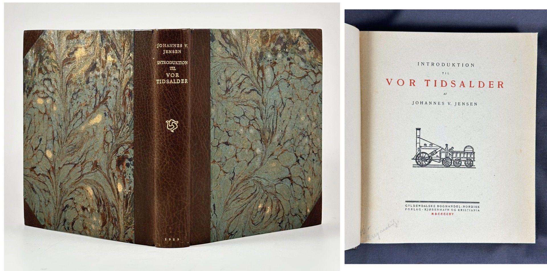 Gyldendal, København 1915. 332 sider. Indbundet ubeskåret med originalt for- og bagomslag i et elegant halvbind af mørkebrunt maroquin med Jensens triskele-bomærke i guld på ryggen (Henning Jensen).