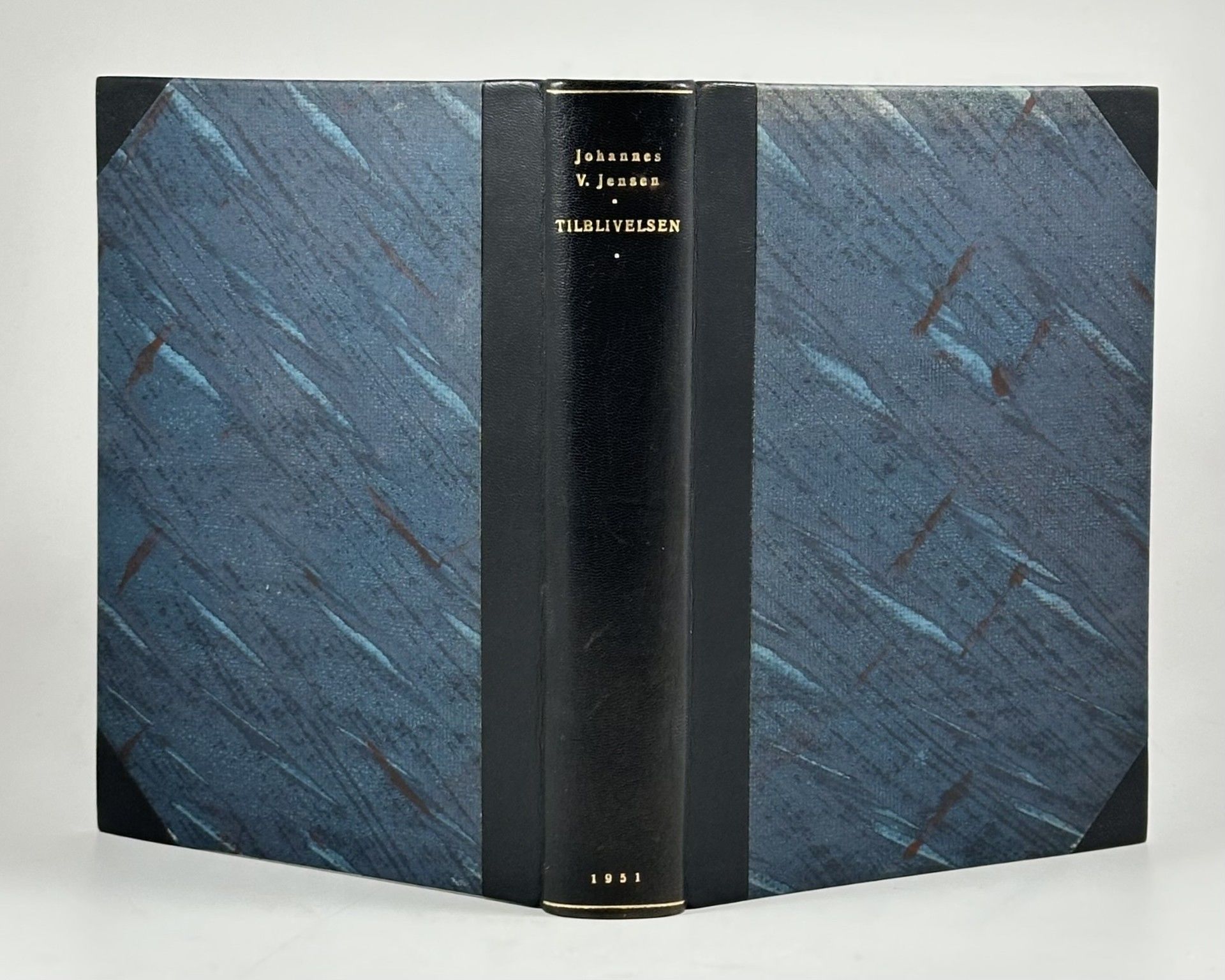Gyldendal, København 1915. 332 sider. Indbundet ubeskåret med originalt for- og bagomslag i et elegant halvbind af mørkebrunt maroquin med Jensens triskele-bomærke i guld på ryggen (Henning Jensen).