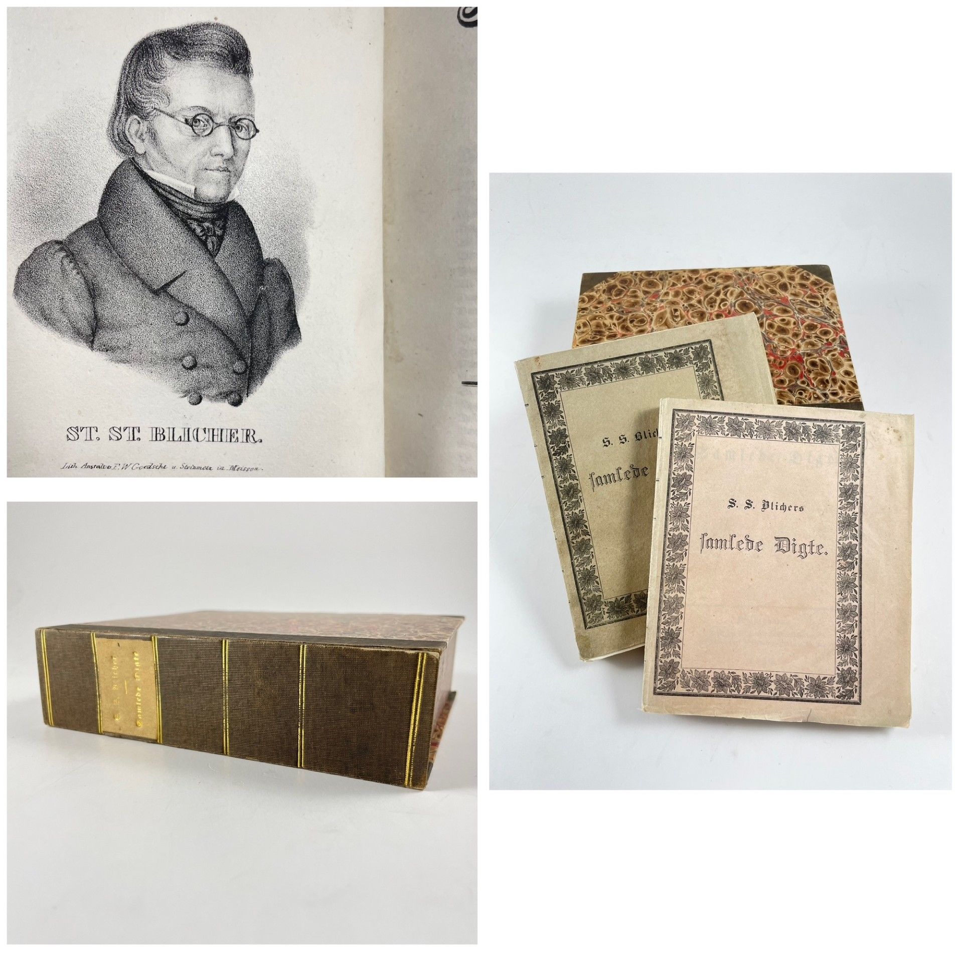 2 bind. C. Steen, København 1835-36. 8vo (15 x 12 cm). (4)+284 + (8)+320 sider. Med litograferet portræt. Helt ubeskåret med brede margener i de originale litograferede omslag. I bogæske med rygstykke af brunt shirting med tidstypisk guldtrykt stregdekoration og bindebånd. Exlibris (Troensegaard). Overstreget navn nederst på foromslaget til bind 1. Gl. navn på indersiden af foromslaget i begge bind. Helt rene og kridhvide bogblokke, trykt på velin. Bageste fals af rygstykket på æsken med revne.