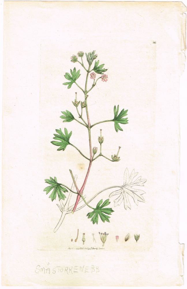 Pl. 385 (Småstorkenebb / Geranium pusillum / Small-flowered Cranesbill). Fra verket “English Botany or, Coloured Figures of British Plants, with their Essential Characters, Synonyms and Places of Growth”.