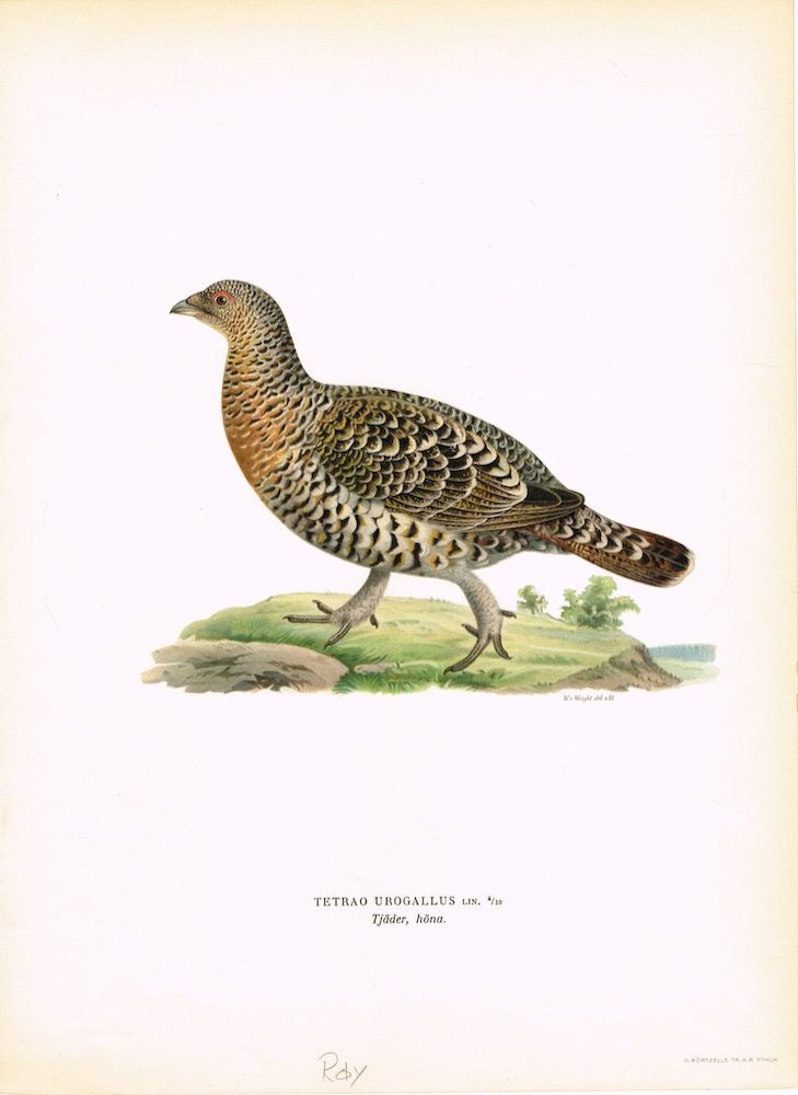 Tetrao Urogallus. Tjäder, höna. (Storfugl, røy). Fra verket “Svenska fåglar efter naturen och på sten ritade ... “