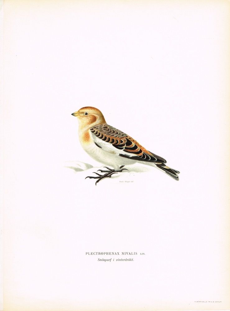 Plectrophenax nivalis. Snösparf i vinterdräkt. (Snøspurv). Fra verket “Svenska fåglar efter naturen och på sten ritade ... “