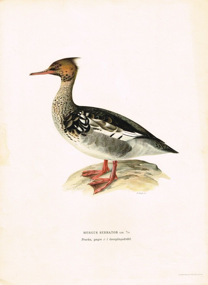 Mergus serrator. Pracka, yngre i övergångsdräkt. (Siland). Fra verket “Svenska fåglar efter naturen och på sten ritade ... “