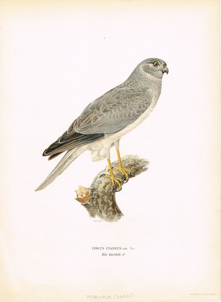 Circus cyaneus. Blå kärrhök (Myrhauk, hann). Fra verket “Svenska fåglar efter naturen och på sten ritade ... “