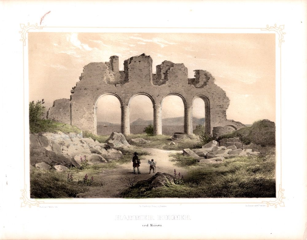 Litografi av “Hammer Ruiner ved Miösen”, tegnet av Frich del C. Müller lith. Hentet fra “Norge fremstillet i tegninger”.
