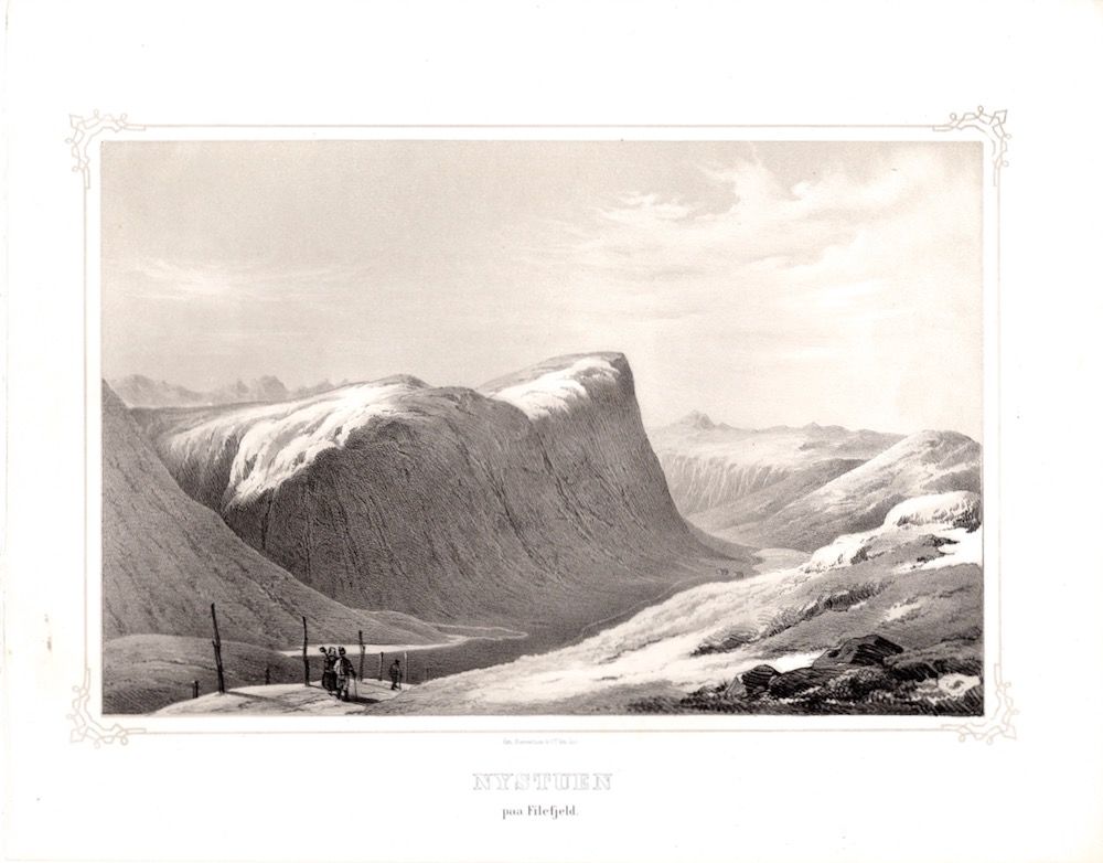 Litografi av “Nystuen paa Filefjeld”. Hentet fra “Norge fremstillet i tegninger”.