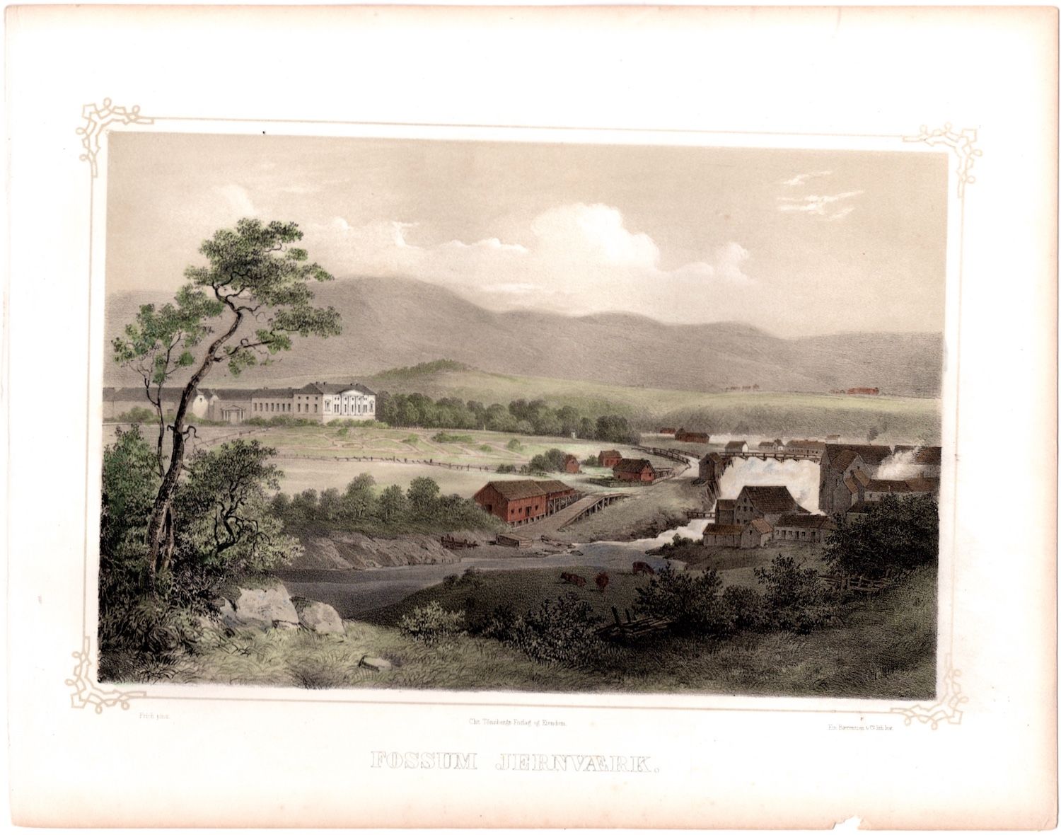 Litografi av “Fossum Jernværk”. Efter A. W. Boesen. Hentet fra “Norge fremstillet i tegninger”.