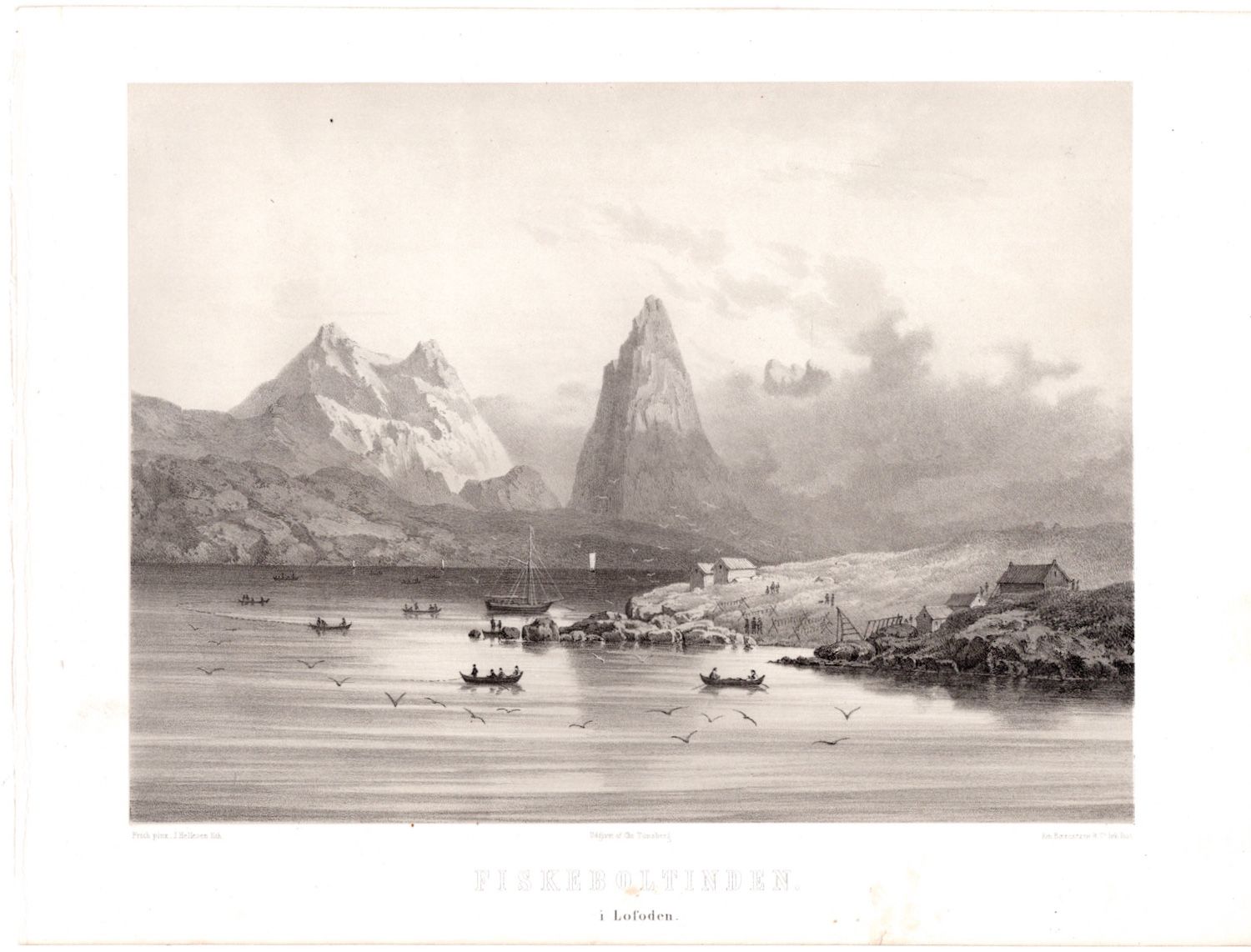 Litografi av “Fiskeboltinden i Lofoden”. Frich pinx.; J. Hellesen lith. Hentet fra “Norge fremstillet i tegninger”.