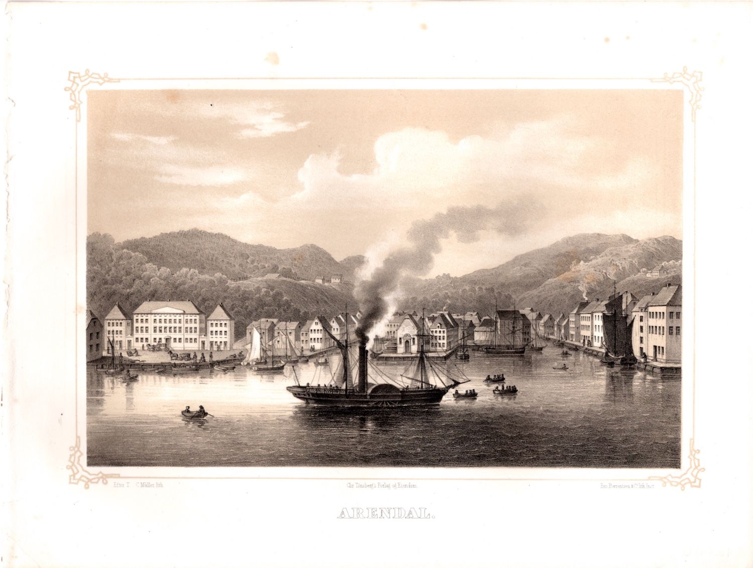 Litografi av “Arendal.” Efter T. ; C. Müller lith. Hentet fra “Norge fremstillet i tegninger”.