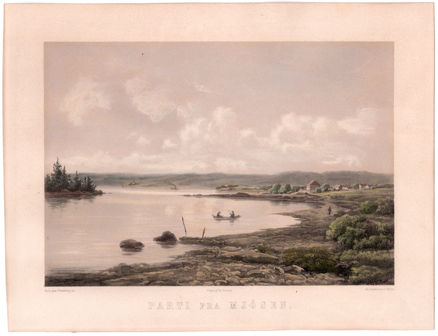 Litografi av “Parti fra Mjösen”. Frich pinx. ; E. Vesterberg lith. Hentet fra “Norge fremstillet i tegninger”.