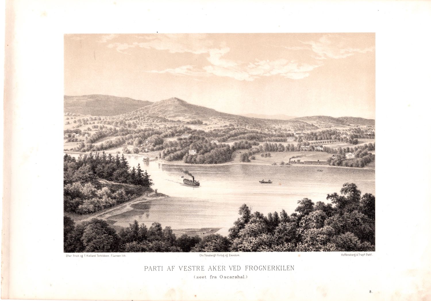 Litografi av “Parti af Vestre Aker ved Frognerkilen (seet fra Oscarshal)”. Efter Frich og T. Kielland Torkildsen ; F. Larsen lith. Hentet fra “Norge fremstillet i tegninger”.