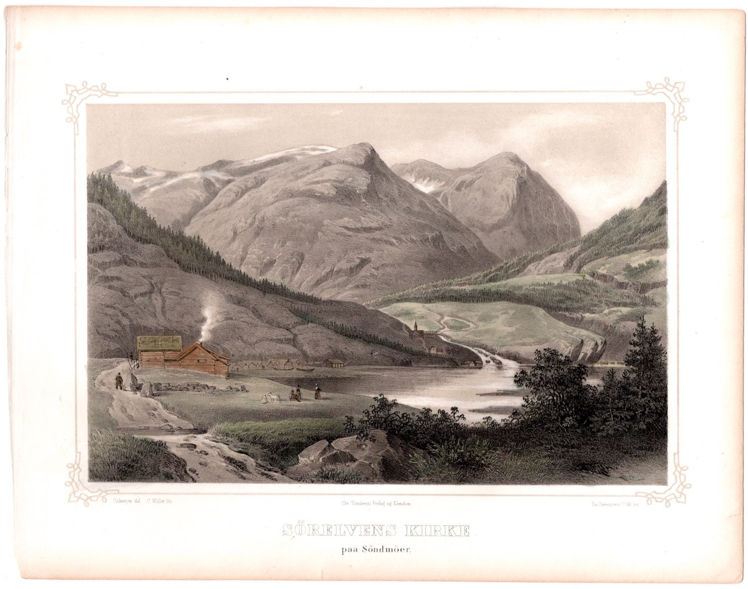 Litografi av “Sörelvens kirke paa Söndmöer”. Frich pinx. Hentet fra “Norge fremstillet i tegninger”.