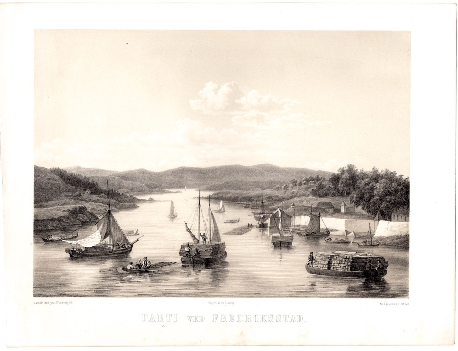 Litografi av “Parti ved Fredriksstad”. Mathilde Smith pinx. ; E. Vesterberg lith. Hentet fra “Norge fremstillet i tegninger”.