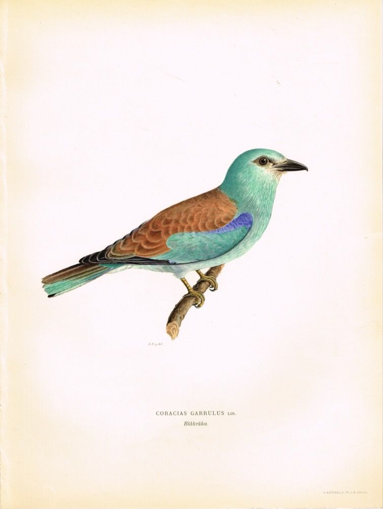 Coracias Garrulus. Blåkråka. (Blåråke). Fra verket “Svenska fåglar efter naturen och på sten ritade ... “
