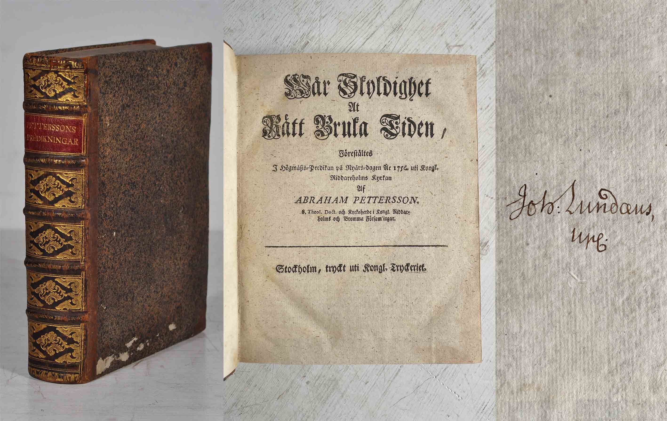Sthlm, Kongl. tryckeriet, (1756). 4:o. 36 s. + PETTERSSON, ABRAHAM. Det är godt, at förtrösta på herran, öfwerwägades i högmässo-predikan på andra söndagen efter trettonde-dagen i kongl. Riddarholms kyrkan, år 1755. Sthlm, L. Salvius, 1763. 4:o. 40 s. + PETTERSSON, ABRAHAM. Wår dödlighets rätta betänkande öfwerwägadt i högmässo-predikan på kyndersmässo-dagen [sic] i kongl. Riddarholms kyrkan, 1754. Sthlm, Kongl. tryckeriet, (1754). 4:o. 35 s. + PETTERSSON, ABRAHAM. Människans företräde och wärde framför alla de andra kreaturen på jorden; betraktadt i högmässo-predikan på andra söndagen i faston, i kongl. Riddarholms kyrkan år 1757. Sthlm, Wildiska tryckeriet, 1757. 4:o. 63 s. + PETTERSSON, ABRAHAM. Guds uplyfta ögon på Swea barn i dessa efter bröd swåra tider, betraktade i högmässo predikan på midfasto söndagen år 1757 uti kongl. Riddareholms församlingen. Sthlm, Wildiska tryckeriet, (1757). 4:o. (4),36 s. + PETTERSSON, ABRAHAM. Wissheten om de dödas upståndelse, förestäld i högmässo-predikan på påska dagen, uti kongl. Ridderholms kyrkan, år 1755. Andra gången uplagd. Sthlm, P. Hesselberg, 1763. 4:o. 79 s. + PETTERSSON, ABRAHAM. Guds nådiga wård om sin kyrka på jorden, förestäld i en christelig predikan för St. Claræ församling på annan dag påska, som war andra dagen efter dess förnyade kyrkas inwigelse i Stockholm, den 23 april 1753. Sthlm, L. Salvius, 1763. 4:o. 36 s. + PETTERSSON, ABRAHAM. Det syndiga missbruk, som sker med bönen Fader wår, förestäldt i högmässo-predikan på böne-söndag år 1756. I kongl. Riddarholms församlingen. Sthlm, J. Merckell, (1756). 4:o. 64 s. + PETTERSSON, ABRAHAM. En rätt guds-tjenst uti en andelig fattigdom, förestäld i den första predikan, som år 1761 på sjette söndagen efter påsk blef hållen, wid Stockholms stads fattighus, uti de fattigas nya guds-tjensts-rum på Sabbats-berg. (Sthlm), Kongl. tryckeriet, 1761. 4:o. (6),66 s. + PETTERSSON, ABRAHAM. En christelig barna-upfostran, öfwerwägad i högmässo-predikan på Michelsmässo-dagen 1753. Uti kongl. Riddarholms kyrkan. Sthlm, L. Salvius, 1754. 4:o. 40 s. + PETTERSSON, ABRAHAM. Guds-fruktan, den enda grunden til et lands och rikes lycksalighet, förestäld uti högmässo-predikan, som blef hållen i deras kongl. majestäters, då warande deras kongl. högheters, hof, på den tjugonde tredje sönd. efter trinit. i Stockholm år 1750. På någras befallning och begäran, samt med tilökning, til trycket lemnad. Sthlm, L. Salvius, 1763. 4:o. 135 s. + PETTERSSON, ABRAHAM. Den nödwändiga föreningen emellan gudsfruktan och rättrådighet i en domares hjärta, förestäld i en christelig prädikan, som för kongl. majest. och riksens höglåflige Swea hof-rätt i Stockholm, wid dess förnyade sammankomst, höst-terminen, år 1748, blef hållen i S. Jacobi kyrka. Sthlm, L. Salvius, 1757. 4:o. 46 s. + PETTERSSON, ABRAHAM. Är Gud en fader, hwar är guds heder? Förestältes i högmässo-predikan, som hölts på fjerde bönedagen i kongl. Riddarholms kyrkan år 1756. Sthlm, Kongl. tryckeriet, (1756). 4:o. 40 s. Vackert samtida hfrbd med upphöjda bind, rikt guldornerad rygg och röd titeletikett med texten: ”Petterssons predikningar”. Stänkta snitt. Ytliga småskador i papperet nedtill på frampärmen. Samtida handskrivet register på eftersättsbladet. Ett fåtal småfläckar. Titelbladet till ”Det syndiga missbruk” lätt bruntonat. Namnteckning ”Joh. Lundæus, Ups.” på frampärmens insida. Fint samlingsband med 13 olika arbeten. Abraham Pettersson (1724-63) var kyrkoherde i Riddarholmens och Brommas församlingar. Han var en av sin tids främsta predikanter. Andra arbetet är i andra upplagan. Det trycktes första gången 1755. I fjärde arbetet motiveras människans företräde framför djuren bland annat med bibelord som ”Det är icke höfligt at taga brödet ifrån barnen och kasta det för hundarna”. Sjätte arbetet trycktes första gången på Wildiska tryckeriet 1755. Sjunde arbett trycktes första gången 1753 av Salvius. Klara kyrka renoverades efter de svåra skador som branden 1751 åsamkat byggnaden. På det nionde arbetet är tryckt: ”Kostar 24 styfwer och säljes för de fattigas räkning”. I inledningen berättas om fattighusets verksamhet och direktion samt att boktryckare Momma tryckt skriften gratis och att papperet skänkts av grosshandlaren Roland Schröder. Den gamla malmgården som Valentin Sabbath uppfört 1717 byggdes om till kyrka 1760-61 av byggmästaren Georg Fröman. Tolfte arbetet är i andra upplagan. Trycktes första gången 1750.