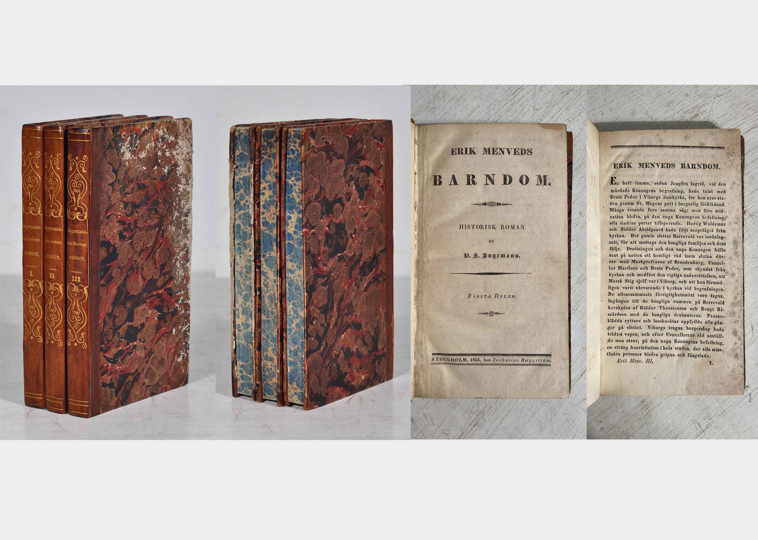 Sthlm, Z. Hæggström, 1833. 8:o. (2),270 + 262 + (2),280 s. Tre samtida bruna hfrbd med dekorativt guldornerade ryggar och felstavade titlar: ”Erik Menvers barndom”. Blåmarmorerade snitt. Brunfläck i övre hörnet de första sidorna i del I. Tredje volymen fuktskadat med frampärmen sliten och skadad och många grå fuktfläckar på de första sjuttio sidorna. Förutom den tråkiga fuktskadan en fin svit. Översättningen gjord av N. V. Lundeqvist. Bernhard Severin Ingemann (1789-1862) var dansk skald och romanförfattare, tillika direktor vid Sorö akademi. Den första danska upplagan utkom 1828 och ingick i en räcka av historiska romaner som Ingemann skrev mellan 1824-36. Enligt ”Danskt biografiskt haandleksikon” ”stod han efter Oehlenschlägers død som den folkekæreste digter”.