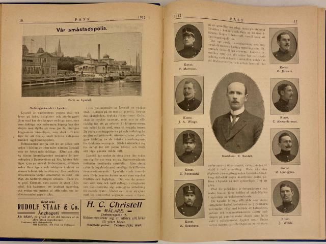 Göteborg 1912. 234, (2) s. Illustrerad. Samtida halvklotband. Gott skick. Pass var en ”fristående tidskrift i såväl polistekniska som organisationsfrågor” som gavs ut mellan åren 1908 och 1916. Här förekommer artiklar inom kriminalvetenskap, utblickar mot utlandet, "vår småstadspolis" och t.ex. om "Trafiksäkerheten i huvudstaden".