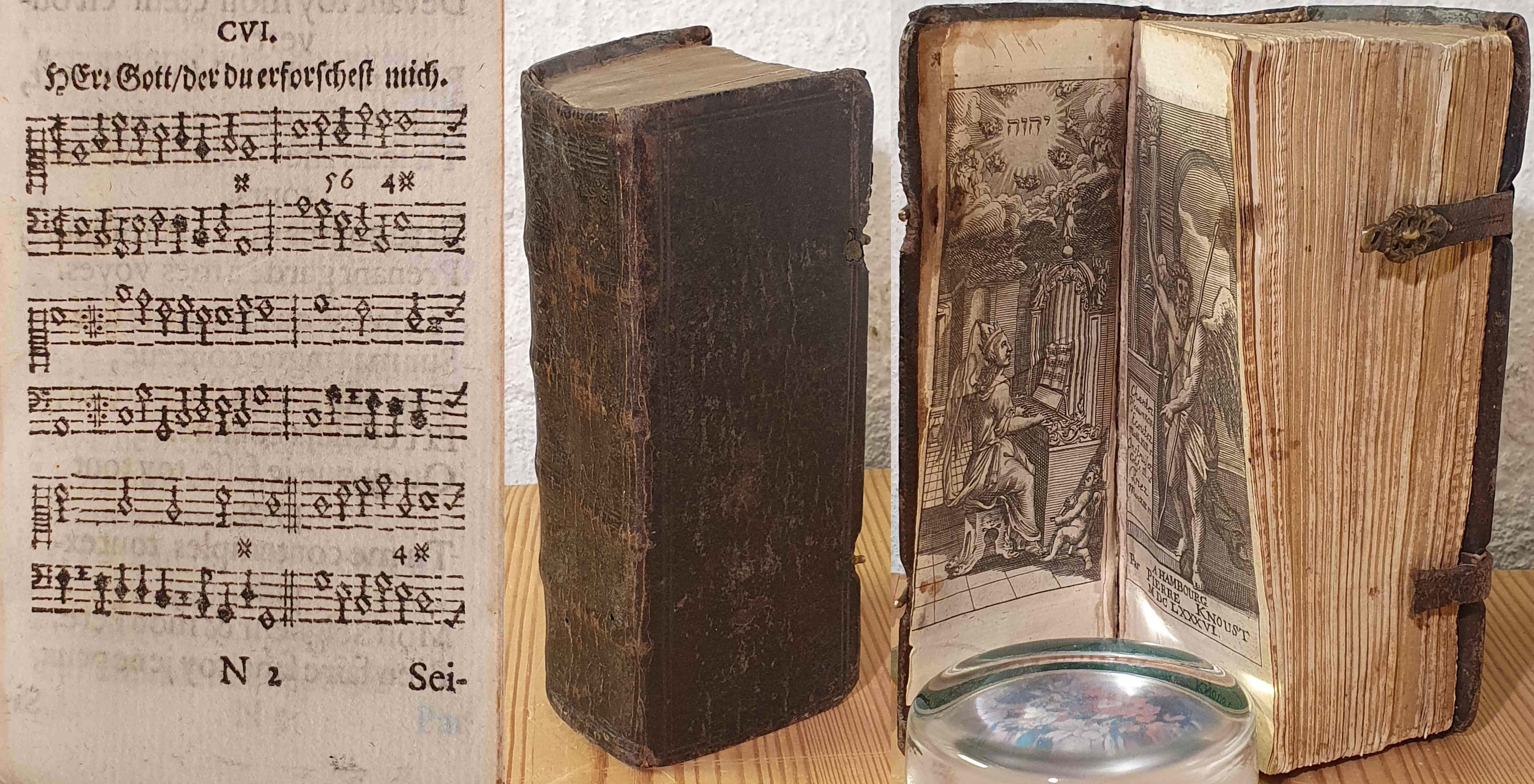 Revuée augmentée & accommondée à toute forte de personnes, à toute forte d'Etats, à toute forte de tems & d'occasions, & par consequent fort propre à s'en fervir pour prier Dieu le matin, le soir, à l'Eglise & pour tout autre exercice de Devotion. Hambourg, Pierre Knoust, 1686 (title-pages to the different parts dated 1685). 12:o. Engraved frontispiece, extra engraved title, (12),296,(2),299-481,(3),485-632,(2),635-764,(1),766,(1),768-800,(1),802-814 pp. Contemporary calf. All edges gilt. Spine with four raised bands. One clasp defect. A small tear at outer edge on pp. 245-248. Small loss at lower cornertip on pp. 397/398 not affecting any text. Brown spot at outer edge on the first pages from the brass clasp. Small booksellers signature in ink at bottom of title-page. Titles to the music notes in german. A very good complete copy. 16 x 6,5 cm.