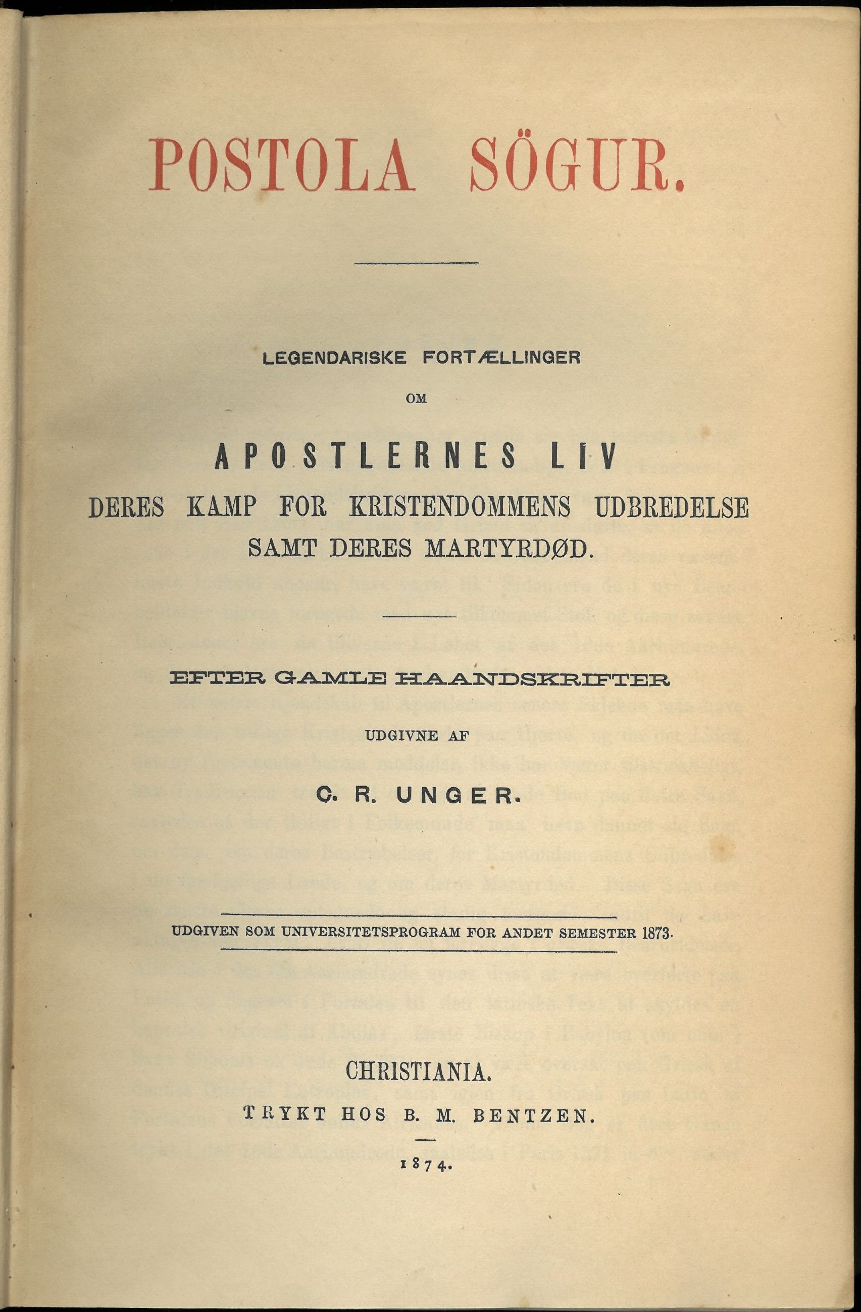 Legendariske fortællinger om apostlernes liv deres kamp for kristendommens udbredelse samt deres martyrdød. Efter gamle haandskrifter udgivne af C. R. Unger. Udgiven som universitetsprogram for andet semester 1873.