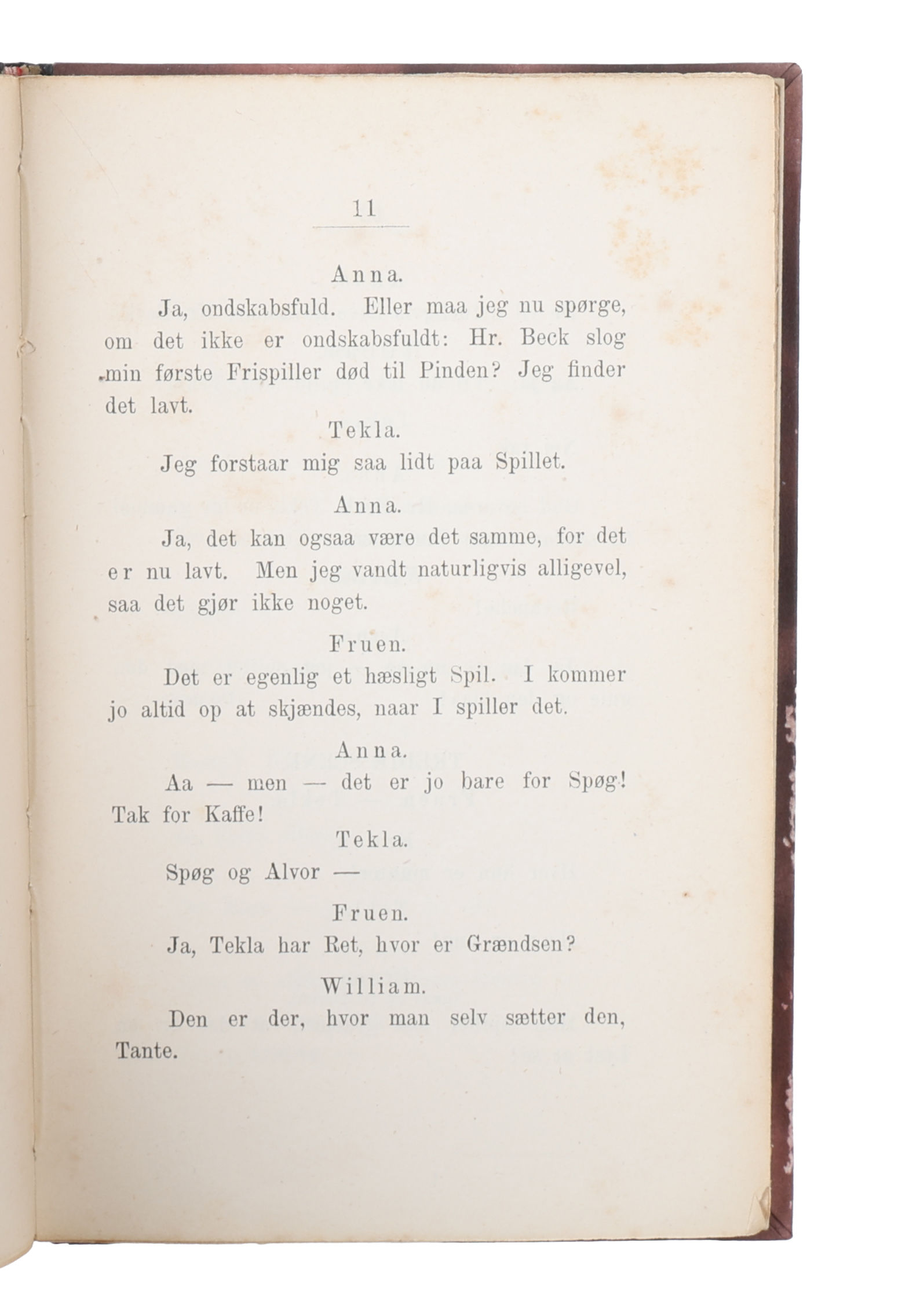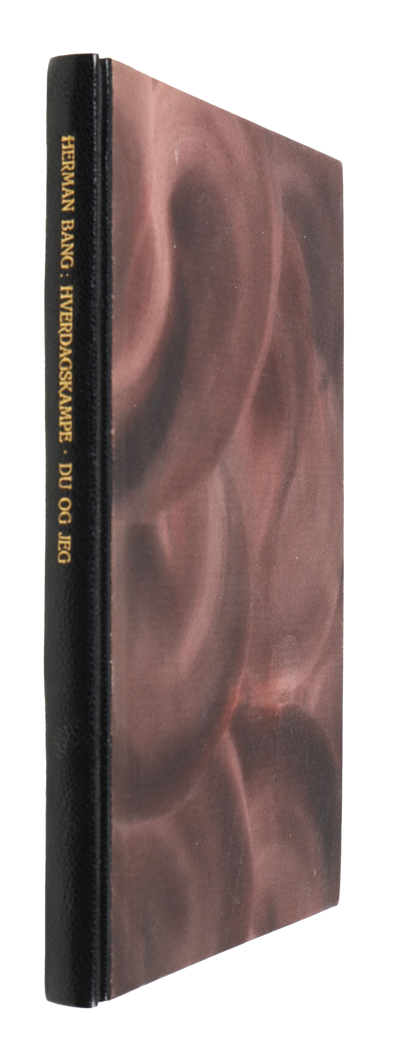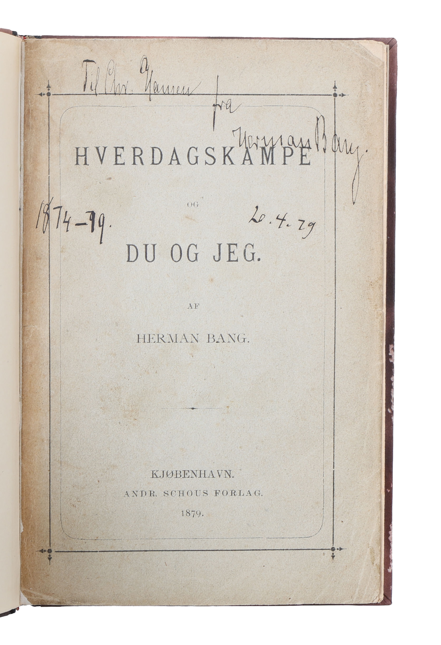 Kjøbenhavn, Andr. Schou, 1879. 12mo. Indbundet med det originale omslag i et nydeligt nyere halvlæderbind med rygforgyldning. En smule brunplettet. 97,(1) pp. Med dedikation fra Herman Bang på titelbladet: "Til Chr. Hansen / fra / Herman Bang / 20.4.79". Ex-libris påklistret verso af forperm (Poul Sandberg) og verso af foromslag (Rudolf Roussell).