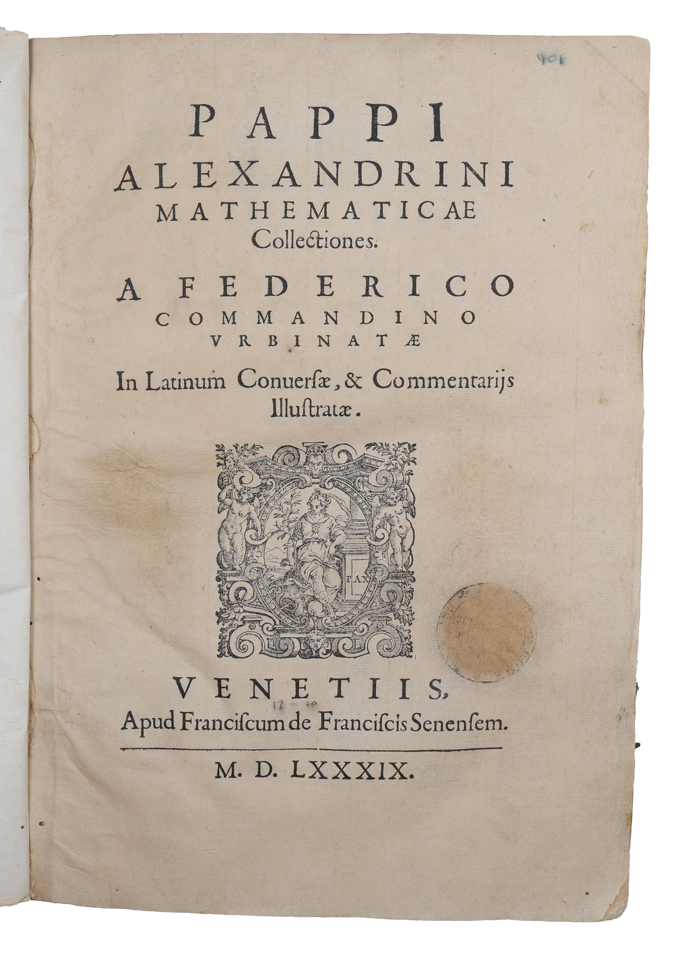 First edition, title-issue (with the fresh title-page stating 1589, but with nothing else reprinted and otherwise through and through the 1588-printing), of Commandino's seminal Latin translation of the work that constitutes the culmination of Greek Mathematics. This printing, which contains the complete extant text of Pappos in Latin translation is responsible for reviving ancient mathematics in the Renaissance and shaping much modern mathematics, profoundly influencing the likes of Descartes and Newton. "Pappos was the greatest mathematician of the final period of ancient science, and no one emulated him in Byzantine times. He was the last mathematical giant of antiquity." (George Sarton, Ancient Science and Modern Civilization. p.82). "Pappus of Alexandria in ab. 320 composed a work with the title Collection (Synagoge) which is important for several reasons. In the first place it provides a most valuable historical record of parts of Greek Mathematics that otherwise would be unknown to us. For instance it is in Book V of the Collection that we learn of Archimedes' discovery of the thirteen semiregular polyhedra or "Archimedian solids". Then, too, the Collection includes alternative proofs and supplementary lemmas for propositions in Euclid, Archimedes, Appolonius and Ptolemy. Finally, the treatise includes new discoveries, and generalizations not found in any earlier work. The Collection, Pappus' most important treatise, contained eight Books, but the first Book and the first part of the second Book are now lost" (Boyer, A History of Mathematics p. 205). "Each book (8) is preceded by general reflexions which give to that group of problems its philosophical and historical setting. The prefaces are of deep interest to historians of mathematics and, therefore, it is a great pity that three of them are lost [...] Book VII is far the longest book of the Collection [...] [and here], we find in it the famous Pappo's problem: "given several straight lines in a plane, to find the locus point, such that when straight lines are drawn from it to the given lines at a given angle, the products of certain of the segments shall be in a given ratio to the product of the remaining ones". This problem is important in itself, but even so because it exercized Descartes' mind and caused him to invent the method of coordinates explained in his Geométrie (1637). Think of a seed lying asleep for more than thirteen centuries and then helping to produce that magnificent flowering, analytical geometry [...] The final Book VIII is mechanical and is largely derived from Heron of Alexandria. Following Heron, Pappos distinguished various parts of theoretical mechanics (geometry, arithmetic, astronomy and physics). The Book is considered the climax of Greek mechanics and helps us to realize the great variety of problems to which the Hellenistic mechanicians addressed themselves. If Book VIII is the climax of Greek mechanics, we may say as well that the whole collection is a treasury and to some extent the culmination of Greek mathematics. [...] The ideas collected or invented by Pappos did not stimulate Western mathematicians until very late, but when they finally did, they caused the birth of modern mathematics- analytical geometry, projective geometry, centrobaric method. That birth or rebirth from Pappos' ashes, occurred within four years (1637-40). This was modern geometry connected immediately with the ancient one as if nothing had happened between." (Georg Sarton op.cit.). - It is from Pappus we have the famous words of Archimedes: "Give me a place to stand, and I will move the earth" (Se PMM No 72). - "Without pretending to great originality, the whole work shows, on the part of the author, a thorough grasp of all the subjects treated, independent of judgement, mastery of technique; the style is terse and clear; in short, Pappus stands out as an accomplished and versatile mathematician, a worthy representative of the classical Greek geometry." (Heath, A History of Greek mathematics Vol. II: p.358). Adams P 224 (The sheets of the Pisauris edition with a fresh title).
