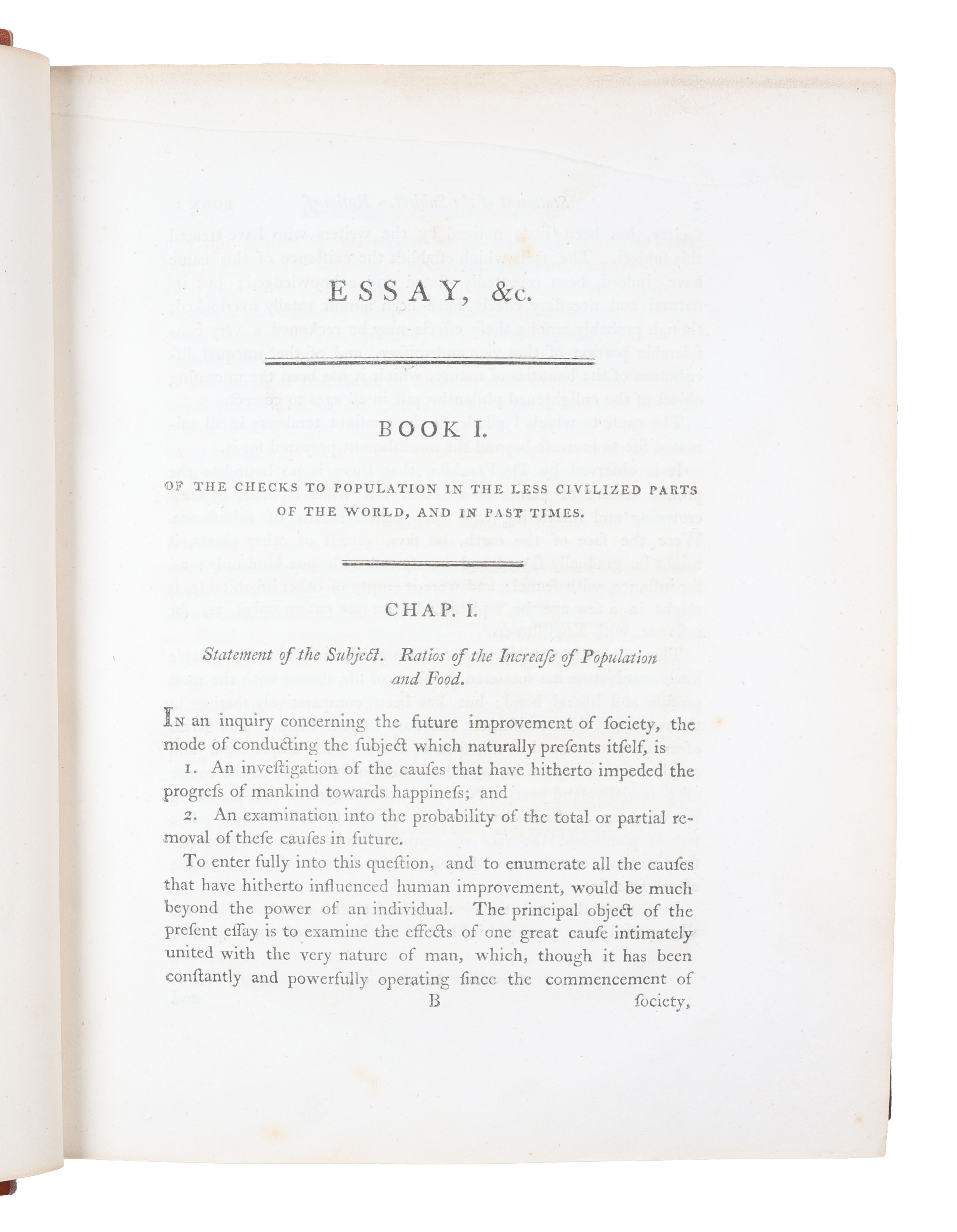 The Great Quarto-edition of Malthus' milestone work, the first and most influential book on population. Although being the second edition, after the anonymously printed first of 1798, it is so significantly altered, revised, and expanded that it is considered a new work rather than a new edition. Malthus himself also thought of it as such. It is nearly four times the length of the 1798 essay, the title has been changed (the title of the first: "An Essay on the Principle of Population, as it Affects the Future Improvement of Society with Remarks on the Speculation of Mr. Godwin, M. Condorcet, and Other Writers"), and it is published with Mathus' name as the author, not anonymously. All later editions were minor revisions of this heavily expanded and altered second one. "In the course of this inquiry, I found that much more had been done, than I had been aware of, when I first published the essay. The poverty and misery arising from a too rapid increase of population, had been distinctly seen, and the most violent remedies proposed, so long ago as the times of Plato and Aristotle. And of late years, the subject had been treated in such a manner, by some of the French economists, occasionally by Montesquieu, and, among our own writers, by Dr. Franklin, Sir James Steuart, Mr. Arthur Young, and Mr. Townsend, as to create a natural surprise, that it had not excited more of the publick attention" (Preface to the second edition, p. IV). The controversial views, because of which the work became so influential, are most provocative and eyeopening in the second edition, in which Malthus for instance for the first time advocates moral restraint (meaning sexual abstinence and late marriage) and elaborately explains his comparison between the increase of population and food. "The "Essay" was highly influential in the progress of thought in the early nineteenth-century Europe.... "Parson" Malthus, as Cobbett dubbed him, was for many, a monster and his views were often grossly misinterpreted... But his influence on social policy, whether for good or evil, was considerable. The Malthusian theory of population came at the right time to harden the existing feeling against the Poor Laws and Malthus was a leading spirit behind the Poor Law Amendment Act of 1834." (PMM 251). Thomas Robert Malthus (1766-1834), called the "enfant terrible" of the economists, was an English demographer, statistician and political economist, who is best known for his groundbreaking views on population growth, presented in his "Essays on the Principle of Population", which is based on his own prediction that population would outrun food supply, causing poverty and starvation. Among other things this caused the legislation, which lowered the population of the poor in England. Malthus actually turned political, economic, and social thought upside down with this work, which has caused him to be considered one of the 100 most influential persons in history (Hart, The 100: A Ranking of the most Influential Persons in History, 1978). Malthus was, naturally, condemned by Marx and Engels, and opposed by the socialists universally, but the work had an enormous impact on not only politics, economics, and social sciences, but also on natural sciences. For instance, both Darwin and Wallace considered Malthus a main source in their development of the theory of natural selection, considering him a great philosopher and his Essay on Population one of the most important books ever. "Malthus’s idea of man’s "Struggle for existence" had decisive influence on Charles Darwin and the theory of evolution. Other scientists related this idea to plants and animals which helped to define a piece of the evolutionary puzzle. This struggle for existence of all creatures is the catalyst by which natural selection produces the "survival of the fittest"... Thanks to Malthus, Darwin recognised the significance of intraspecies competition between populations of the same species (e.g. the lamb and the lamb), not just interspecies competition between species (e.g. the lion and the lamb). Malthusian population thinking also explained how an incipient species could become a full-blown species in a very short timeframe." The second edition must be considered the most important of all the editions. This is far more a work on the problems of over-population than it is a response to Godwin and Condorcet on their works (whic is the main concern of the first edition). "Not so much shocked by his own conclusions, in his "Essay on Population" (first ed. 1798), as driven by a naturally inquiring mind, he travelled for three years through Europe gleaning statistics and then published a second edition (1803)." (Catlin, A History of the Political Philosophers, 1939, p. 377). PMM 251 (first edition).