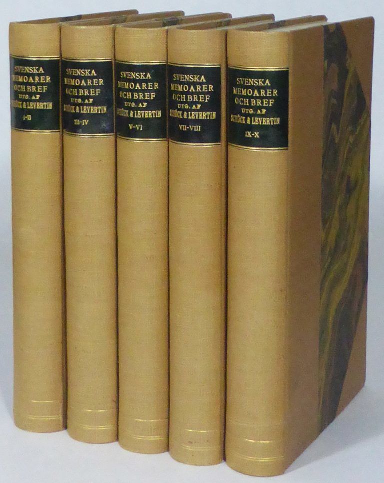 Stockholm; Bonniers, 1900-1906. 22x15 cm. (9, 1 blank), 238 & xv, (1 blank), 278 & xxix, (1), 250 & (3, 1 blank), 228 & viii, 240 & xxvii, (1 blank), 230 & xx, 226 & l, (1, 1 blank), 199, (1 blank) & (5, 1 blank), 280 & xiii, (1, blanka), 248 s. Fem osignerade bruna halvklotband med ryggetikett i svart skinn, marmorerade pärmpapper. Samtliga omslag medbundna. Övre snitten obetydligt solkade. En fin uppsättning. En ny serie påbörjades 1918 men endast en del utgavs i denna och saknas här. Innehåll: I. Öfverste Brelins anteckningar 1809-1818 / J. G. Oxenstiernas Mitt minne / Uno von Troils själfbiografi och reseanteckningar. II. Bibliotekarien C. C. Gjörwells familjebref. III. Fredenheims och Mennanders brefväxling, i urval utgifven af Henrik Schück. IV. Anekdoter till svenska historien under Gustaf III:s regering, af Adolf Ludvig Hamilton. V. Gustaf III:s resa i Italien. Anteckningar af Gudm. Göran Adlerbeth. VI. Bref från Elis Schröderheim. VII. Ur Geijers brefväxling. Familjebref af Erik Gustaf Geijer. VIII. Ur J. M. Sprengtportens papper. Minnesanteckningar. IX. Ur Nils von Rosensteins brefsamling. Bref från Rosenstein, Staël von Holstein, Leopold, Adlerbeth och Kellgren. X. Ur Clas Flemings papper. Bref från Fleming, Reuterholm, Fabian Wrede, Leopold och J. H. Schröder.